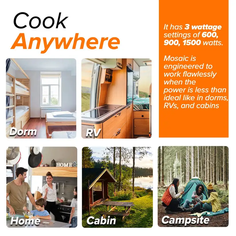 - Variable Wattage: 600 W, 900 W, or 1500 W settings