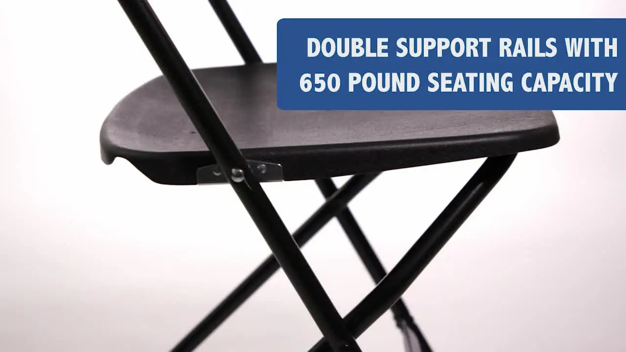 They can be nested horizontally to stack up to 50 chairs high from the floor or vertically in closets or sheds. With a combination of double-support braces and 18-gauge steel frames, these small folding chairs support up to 650 pounds of static weight and withstand years of quality use at indoor or outdoor events.