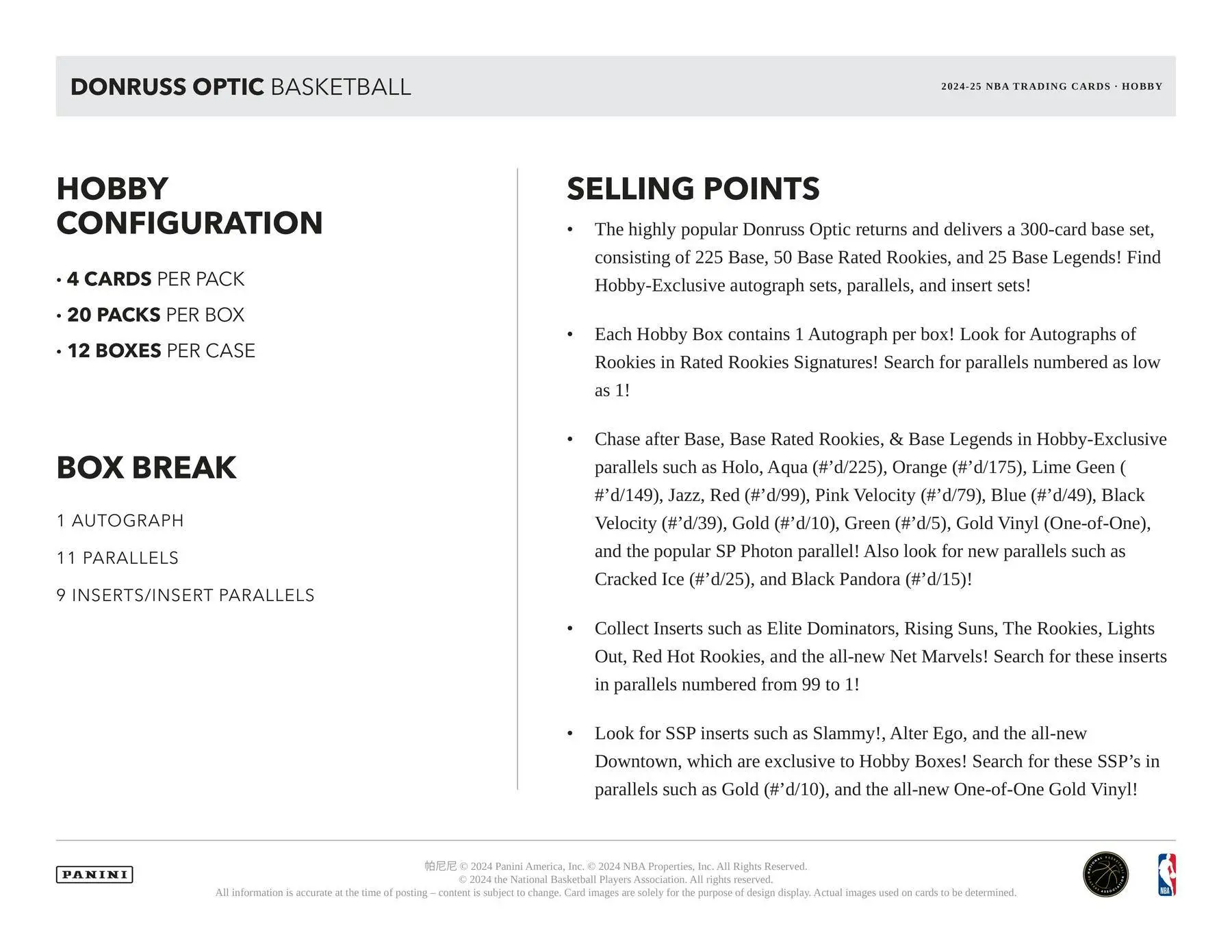 The highly popular Donruss Optic returns and delivers a 300-card base set, consisting of 225 Base, 50 Base Rated Rookies, and 25 Base Legends! Find Fast Break-Exclusive autograph sets, parallels, and insert parallels!