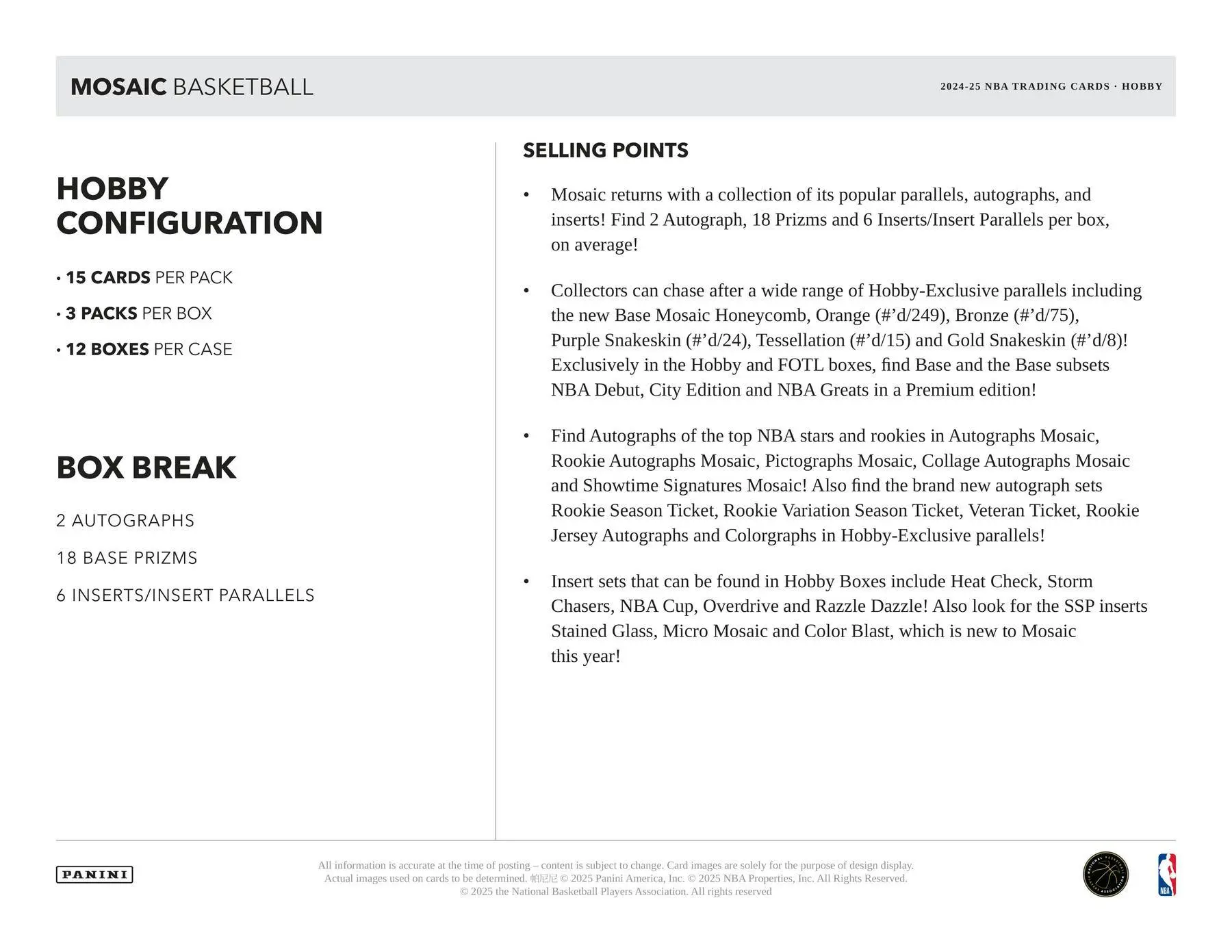 Collectors can chase after a wide range of Hobby-Exclusive parallels including the new Base Mosaic Honeycomb, Orange (#'d/249), Bronze (#'d/75), Purple Snakeskin (#'d/24), Tessellation (#'d/15) and Gold Snakeskin (#'d/8)! Exclusively in the Hobby and FOTL boxes, find Base and the Base subsets NBA Debut, City Edition and NBA Greats in a Premium edition!