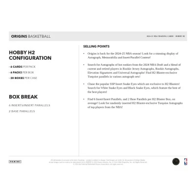 Origins is back for the 2024-25 NBA season! Look for a stunning display of autograph, memorabilia, and insert and parallel content! Find 6 inserts or insert parallels and 2 base parallels per H2 Box on average! Look for randomly inserted H2-Exclusive Turquoise Autographs of top players from the NBA!