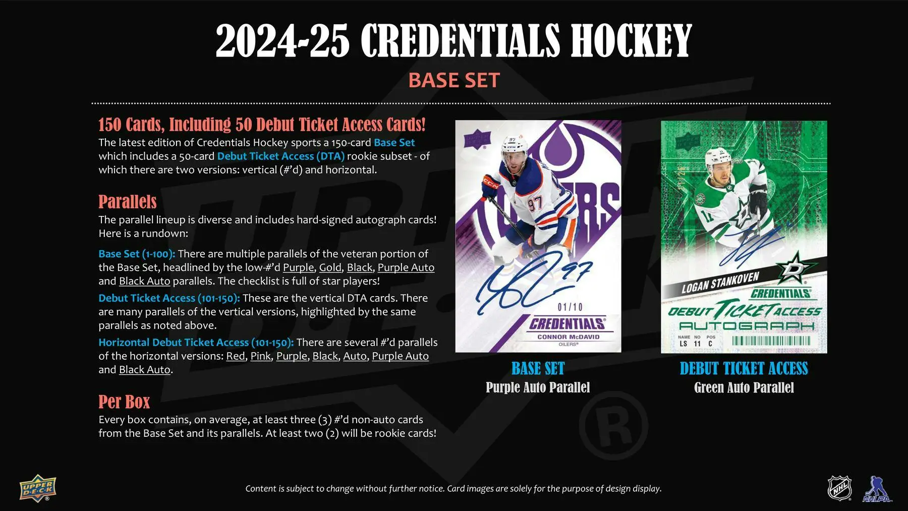 The latest edition of Credentials Hockey sports a 150-card Base Set which includes a 50-card Debut Ticket Access (DTA) rookie subset - of which there are two versions: vertical (#'d to 999) and horizontal. The parallel lineup is diverse and includes hard-signed autograph cards! Here is a rundown: