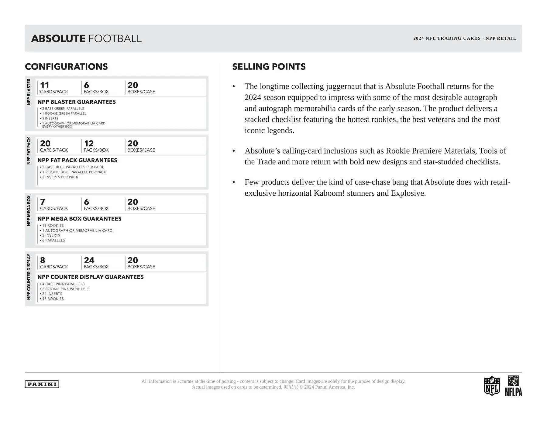Absolute Football is a venerable collecting staple that honors the top NFL stars and rookies. Look for Green Base and Rookie Card parallels as well as a healthy array of retail-only autograph and memorabilia cards, featuring the loaded 2024 Rookie Class!