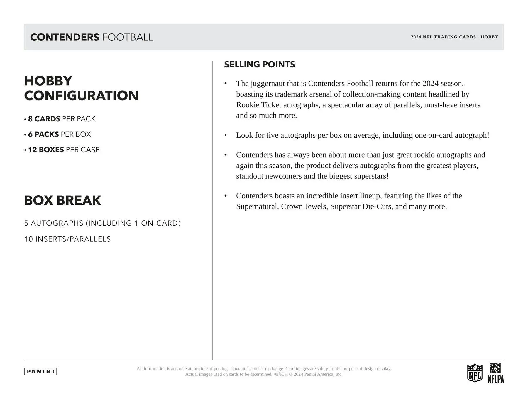 The juggernaut that is Contenders Football returns for the 2024 season, boasting its trademark arsenal of collection-making content headlined by Rookie Ticket autographs, a spectacular array of parallels, must-have inserts and so much more.