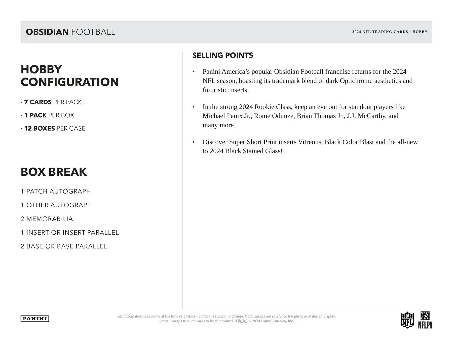 Panini America's popular Obsidian Football franchise returns for the 2024 NFL season, boasting its trademark blend of dark Optichrome aesthetics and futuristic inserts.