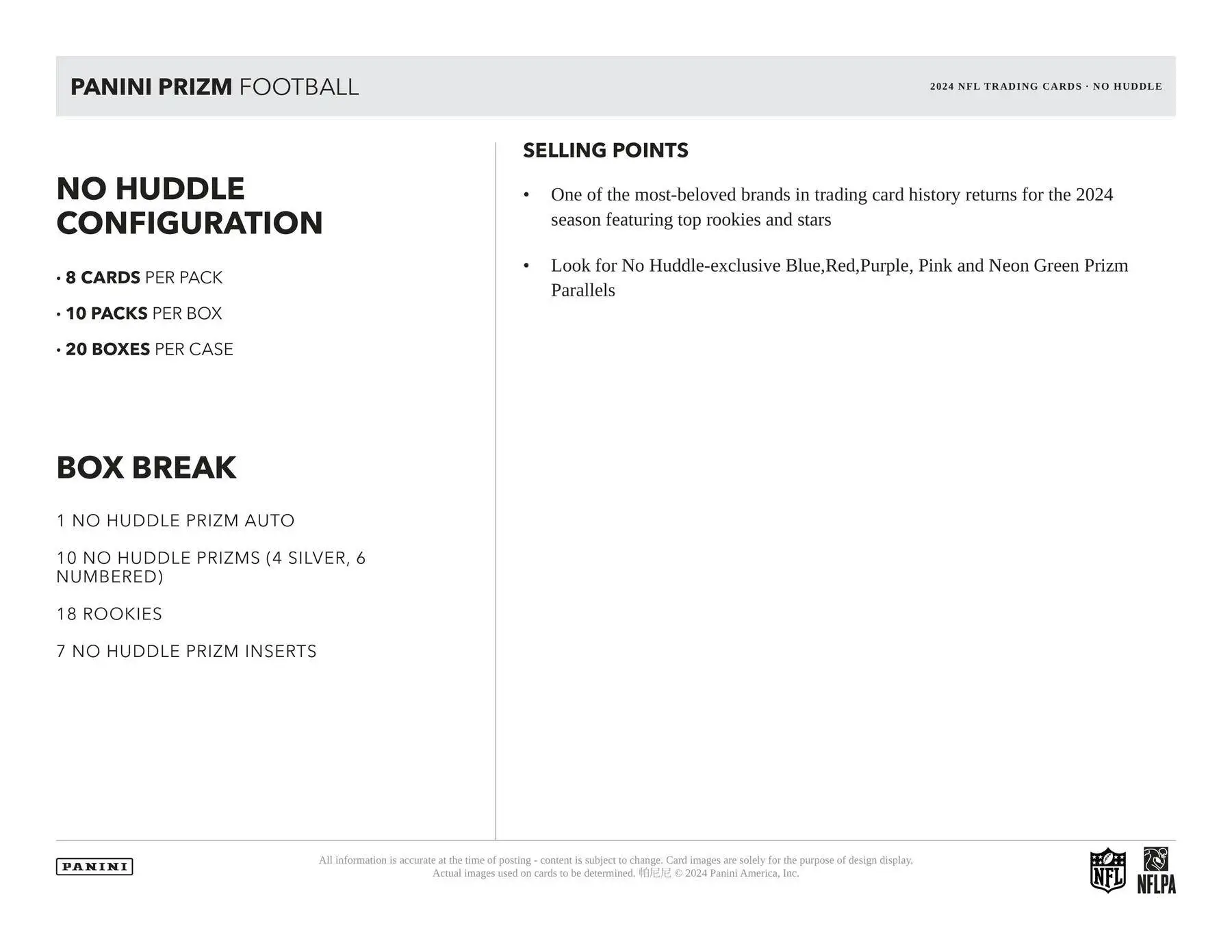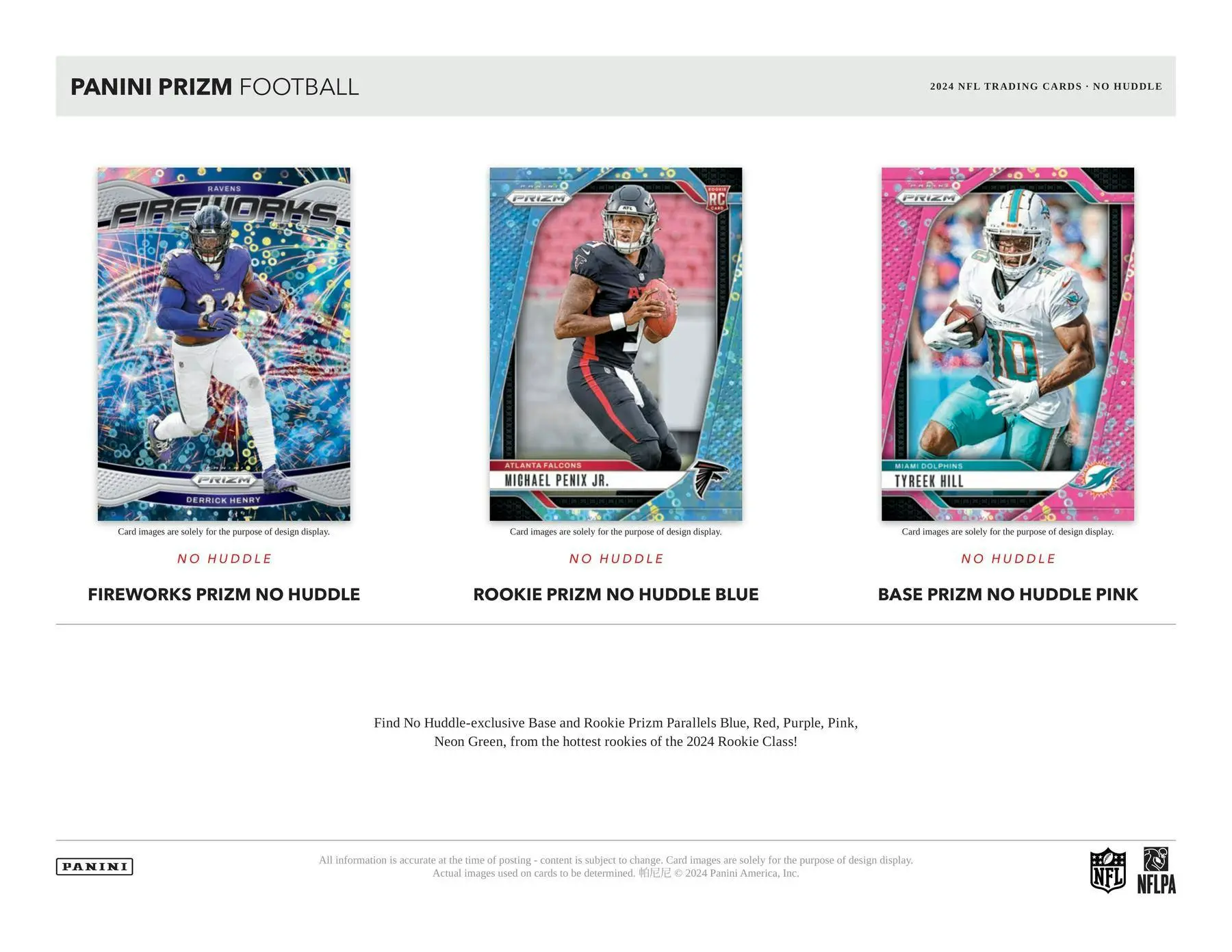 FIREWORKS PRIZM NO HUDDLE / ROOKIE PRIZM NO HUDDLE / BASE PRIZM NO HUDDLE: Find No Huddle-exclusive Base and Rookie Prizm Parallels Blue, Red, Purple, Pink & Neon Green from the hottest rookies of the 2024 Rookie Class!
