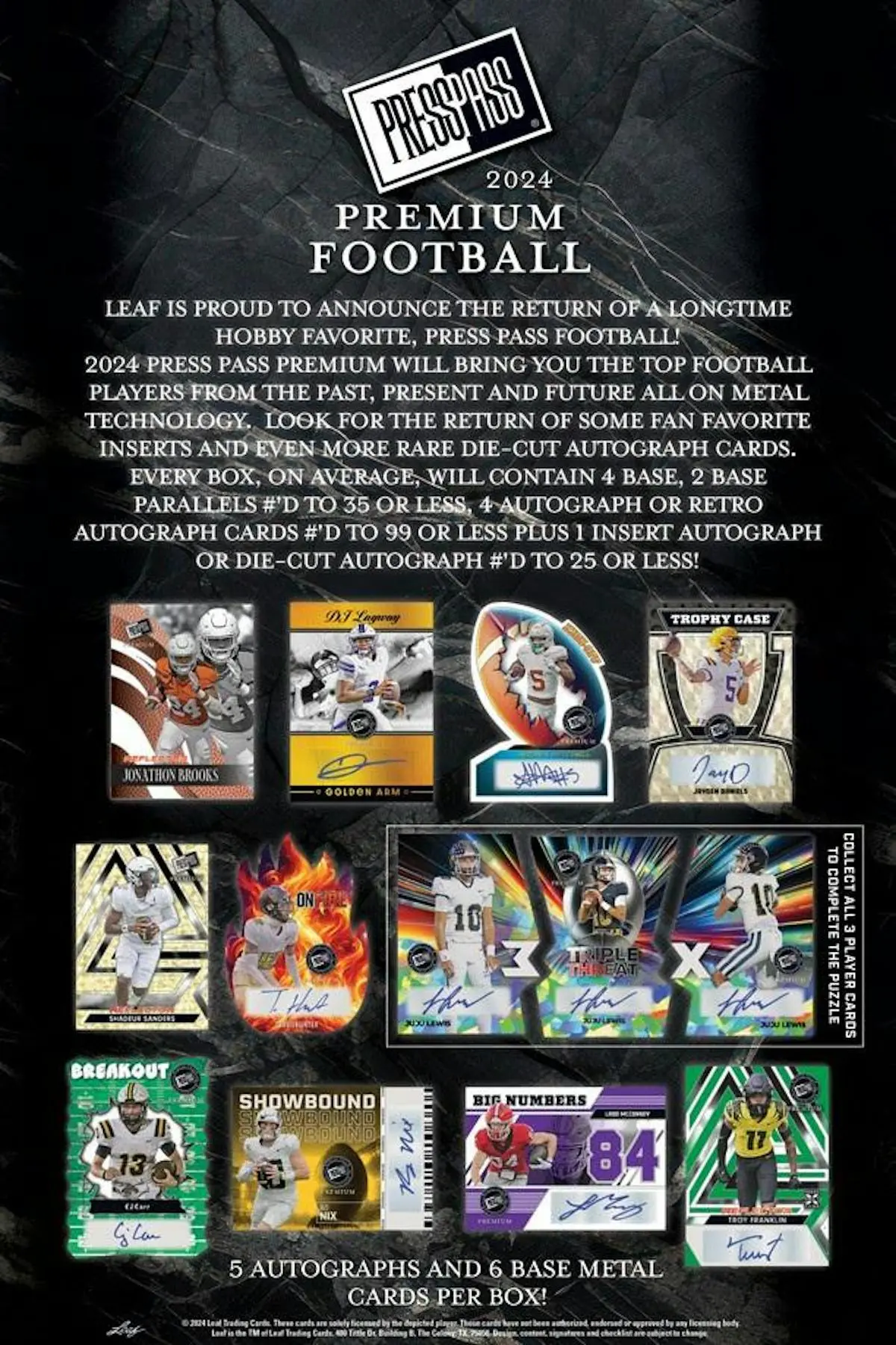 2024 Press Pass Premium will bring you the top football players from the past, present and future all on metal technology. Look
