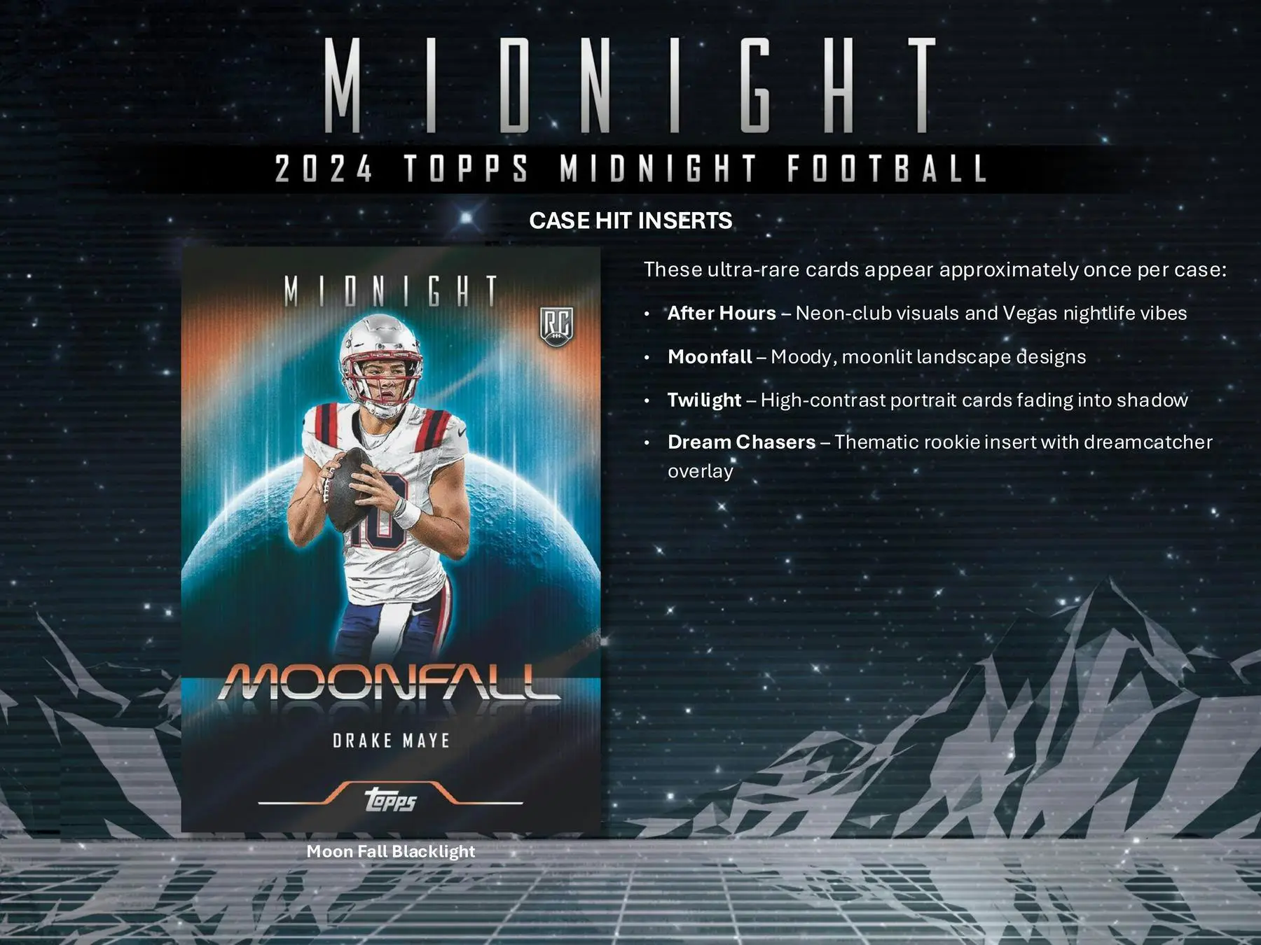 Step into the mystique of 2024 Topps Midnight Football - an all-new brand in the Topps Football lineup. Designed with bold black Chrome styling and a lunar-inspired theme, Midnight Football brings stunning contrast, rich color bursts, and ethereal artwork to the hobby.