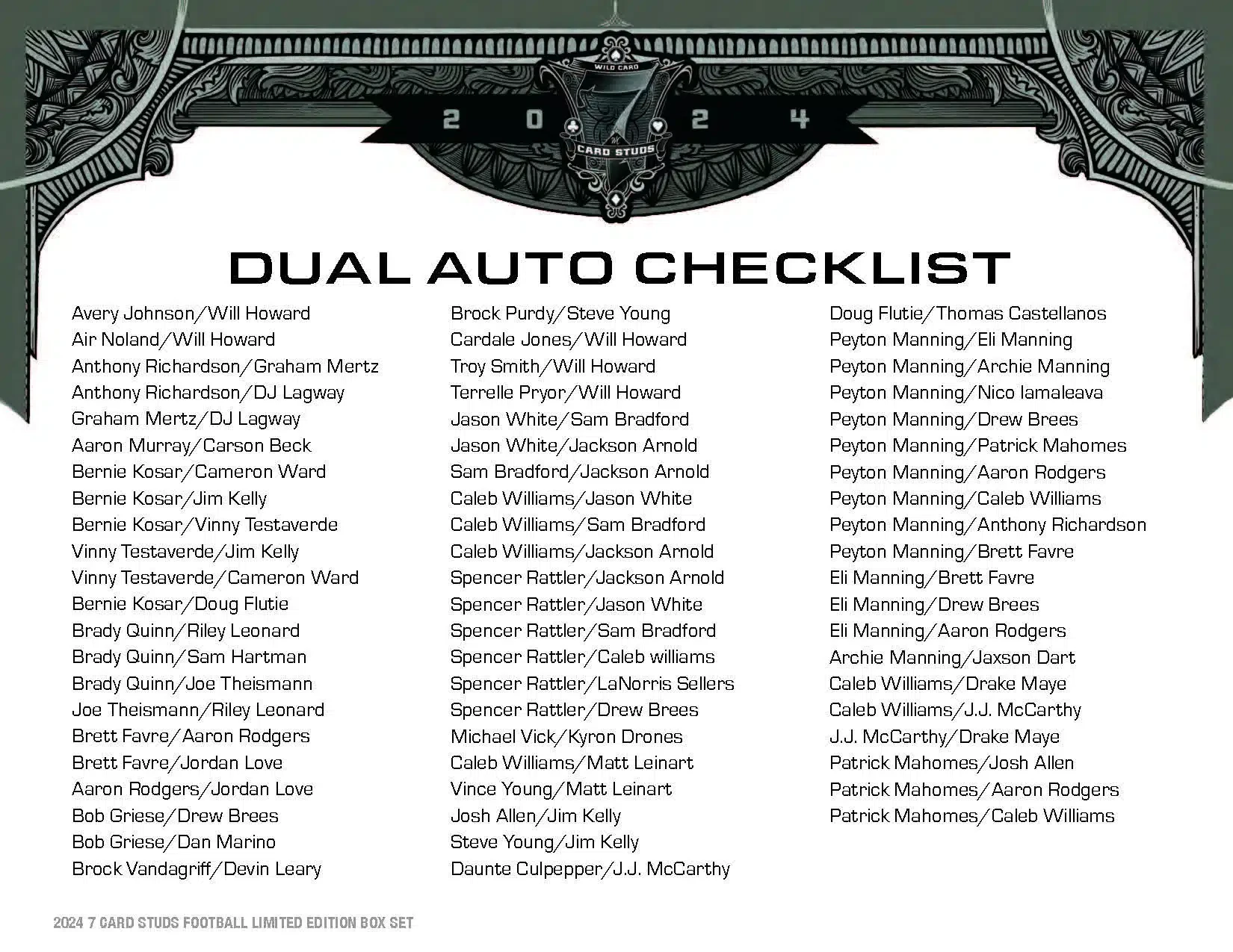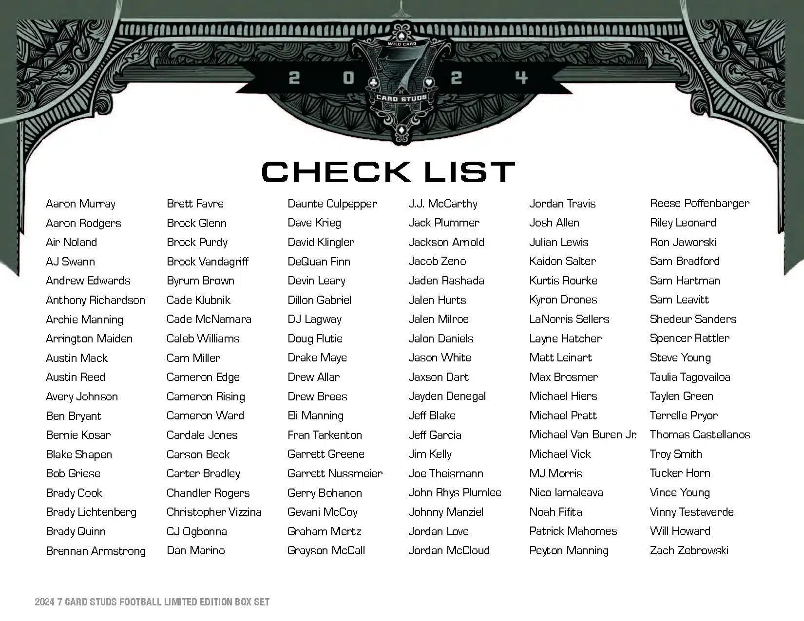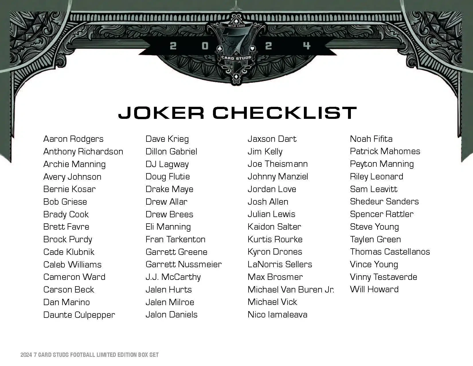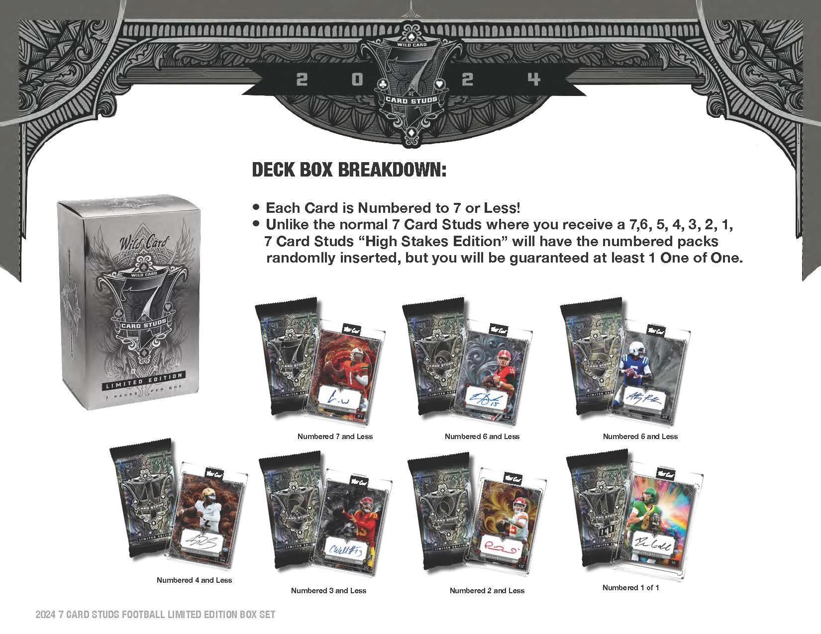 - PLEASE NOTE: Unlike the normal 7 Card Studs where you receive a 7,6, 5, 4, 3, 2, 1, 7 Card Studs “High Stakes Edition” will have the numbered packs randomly inserted, but you will be guaranteed at least 1 One of One.