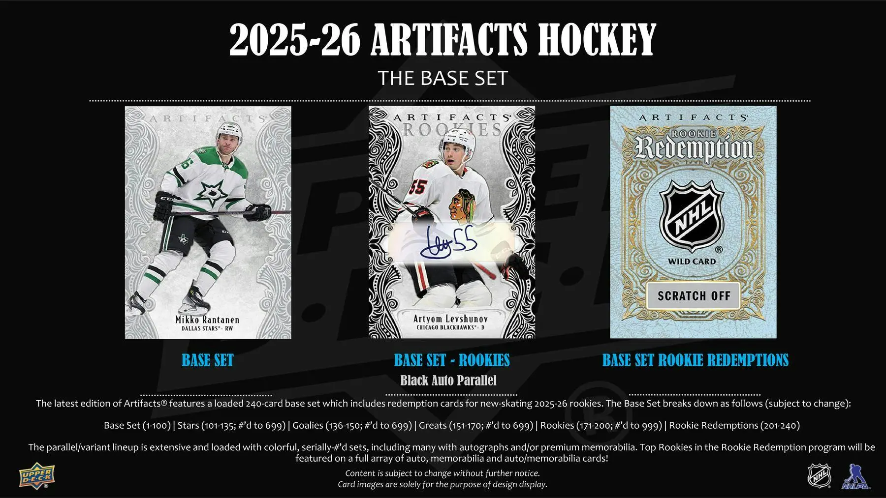 The latest edition of Artifacts features a loaded 240-card base set which includes redemption cards for new-skating 2025-26 rookies. The base set breaks down as follows