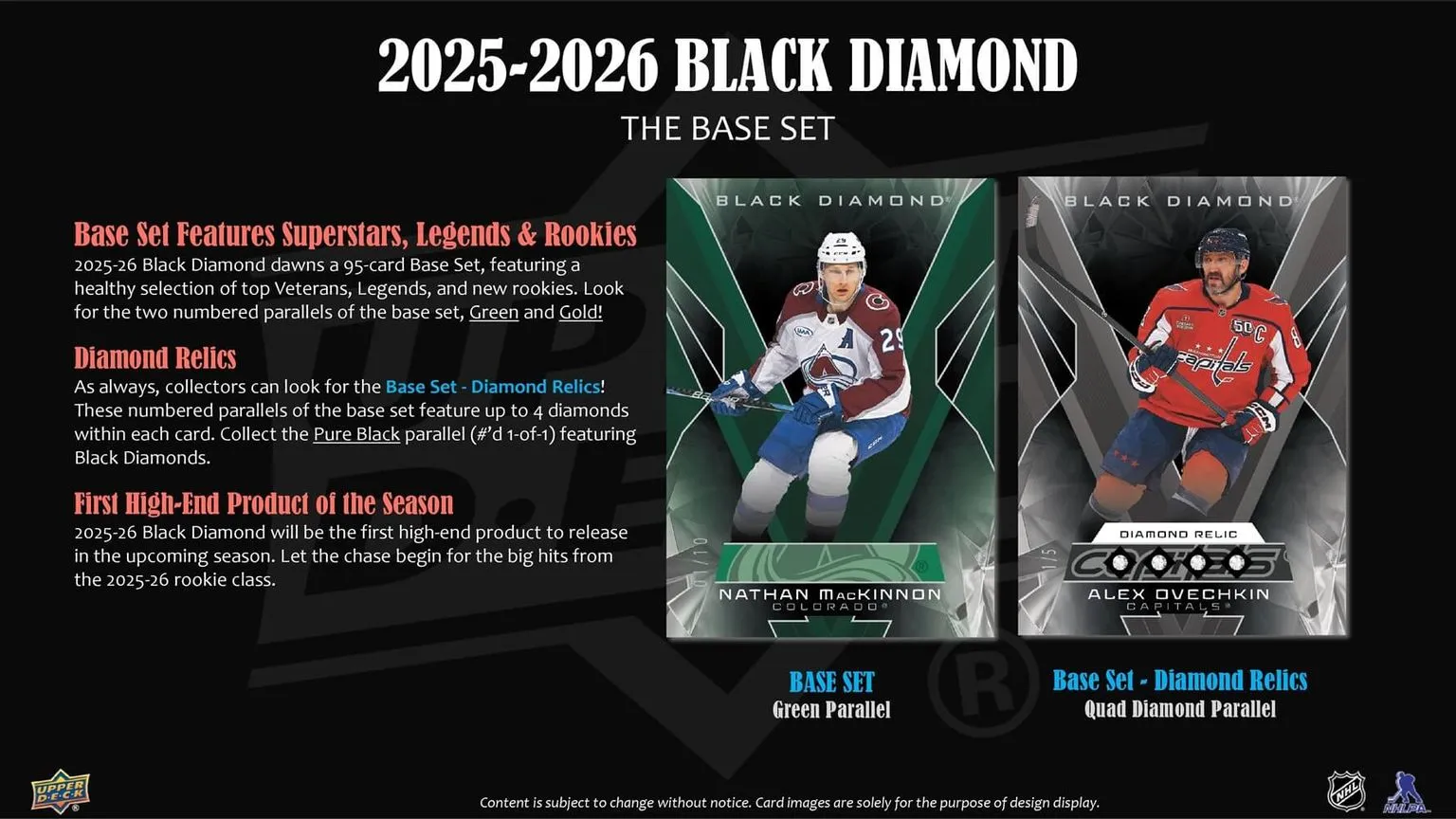 - 2025-26 Black Diamond dawns a 95-card Base Set, featuring a healthy selection of top Veterans, Legends, and new rookies. Look for the two numbered parallels of the base set, Green and Gold.