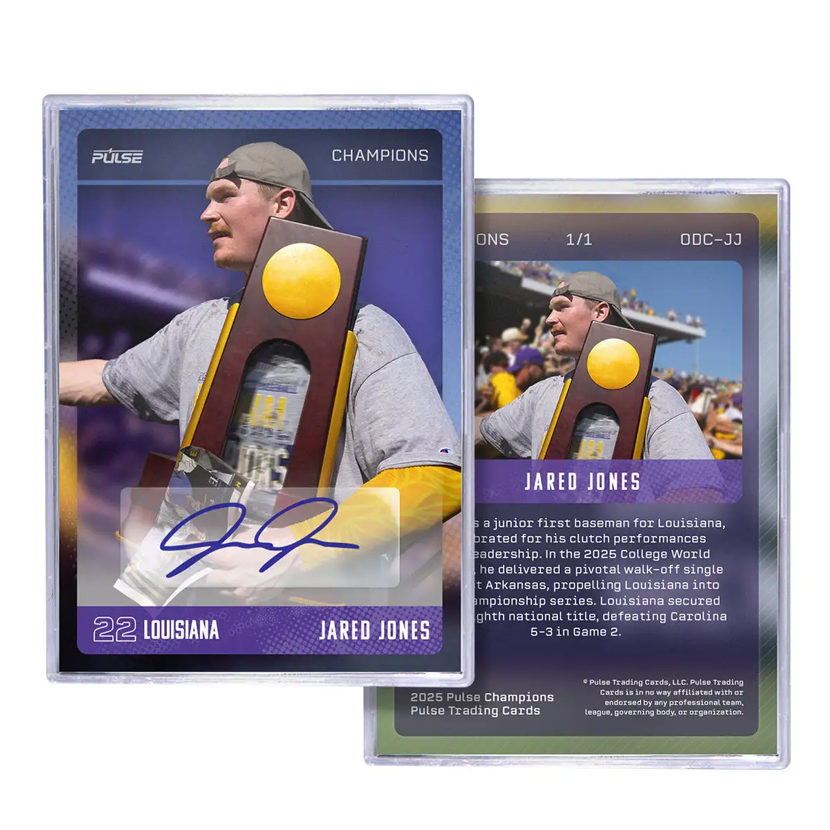 Celebrate a legendary title run with this limited-edition 3-card autographed set from Pulse On Demand, featuring Jared Jones, Steven Milam, and Anthony Eyanson — all stars of the 2025 College World Series championship team.