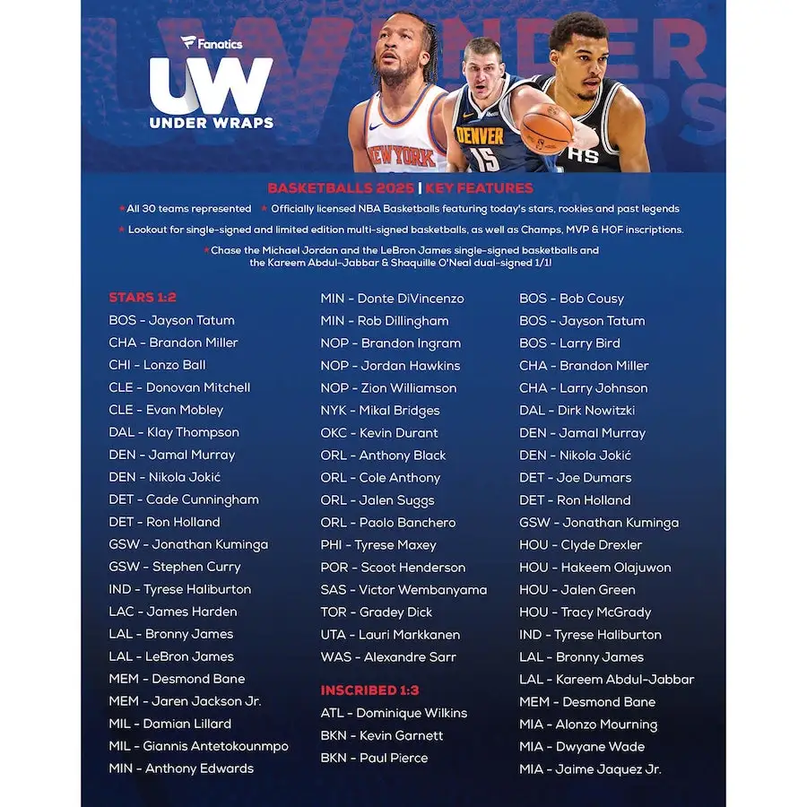 Fanatics presents Under Wraps NBA Basketballs 2025, the only officially licensed NBA mystery program. This mystery program offers the chance to unwrap hand-signed basketballs from the biggest names in the NBA, past and present! The checklist features (5) exciting autograph tiers to collect including: Stars, Legends, Inscribed, Specialty and Multi-Signed! Lookout for stars like Stephen Curry, Victor Wembanyama and Kevin Durant, plus legends featuring Kareem Abdul-Jabbar, Dwyane Wade and Magic Johnson. Key chases including a Michael Jordan and a LeBron James single-signed basketball, plus a Victor Wembanyama Swarovski studded 1/1! Under Wraps NBA Basketballs 2025…start your collecting journey today!