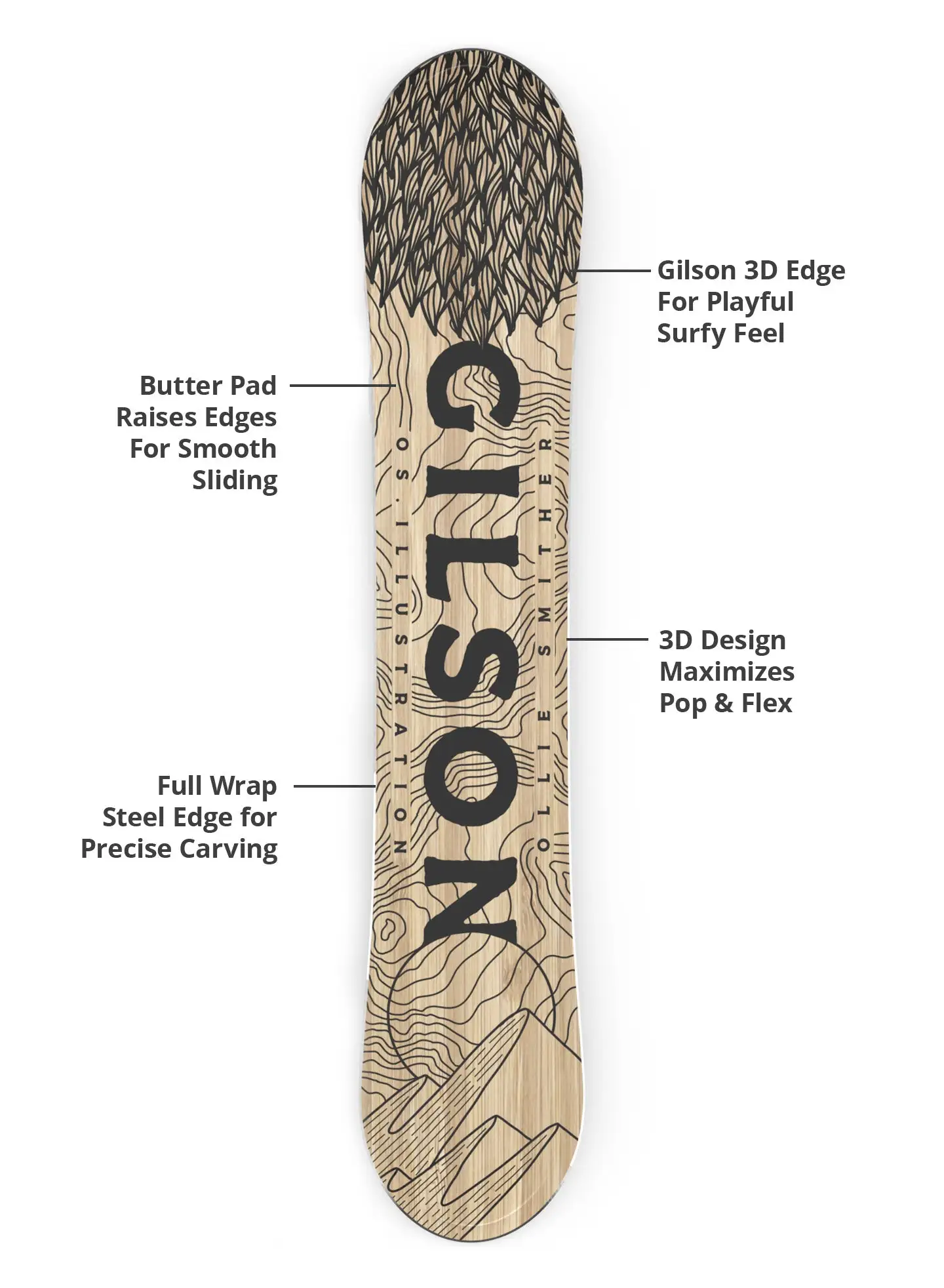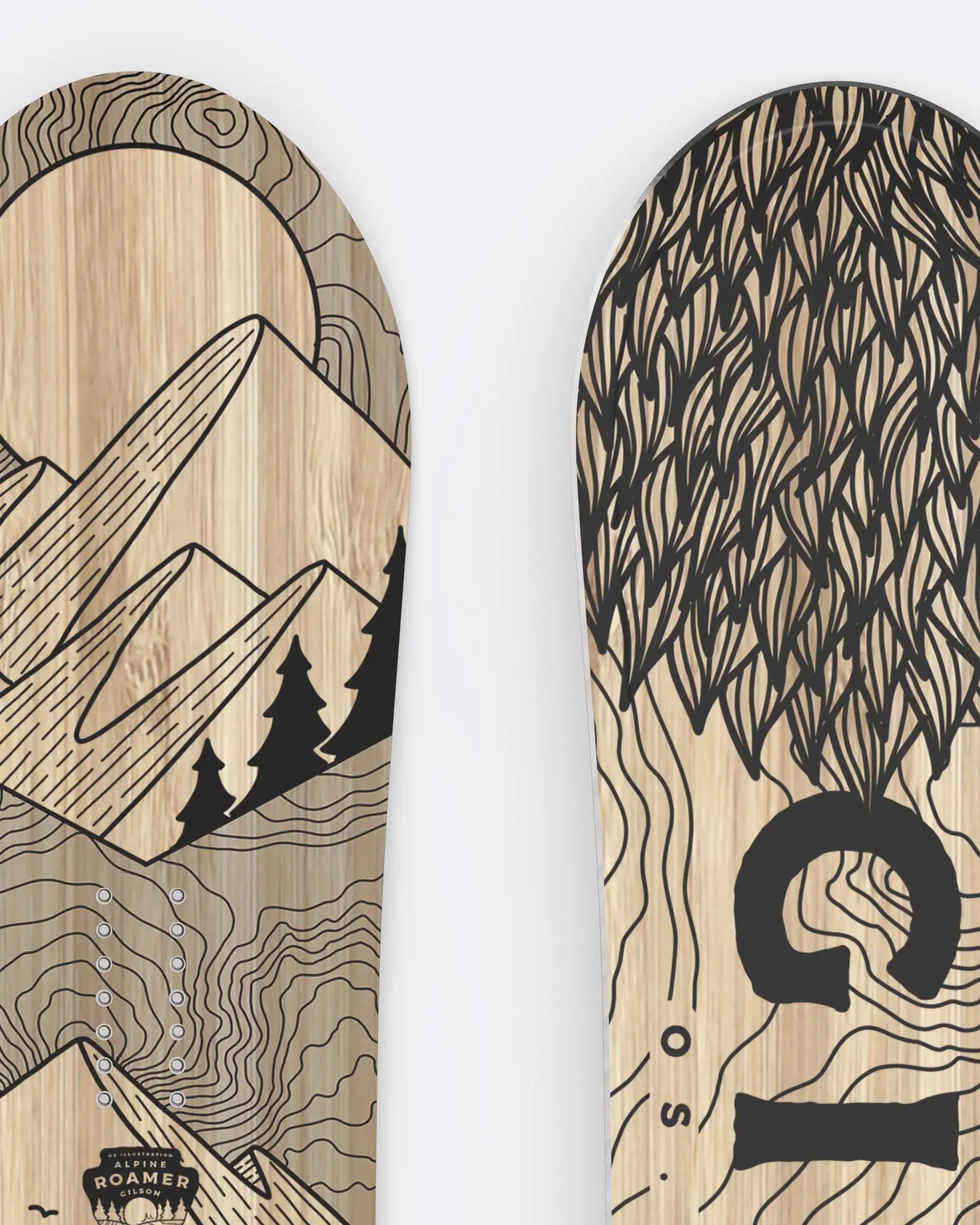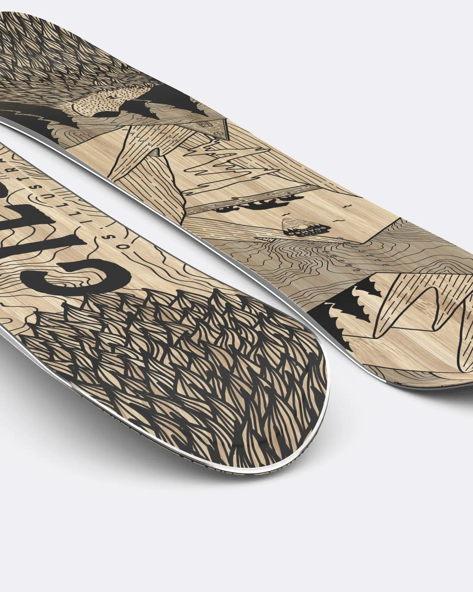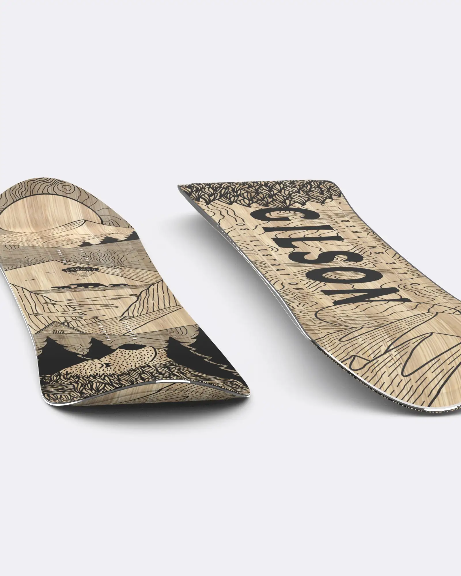 The Alpine Roamer Snowboard captures the call of the wild through fine line illustration by OS Illustrations. With mountains, forests, and wildlife etched into the board’s real wood core, this Limited Edition design pairs natural beauty with rugged performance. Built on GILSON’s Hybrid Camber All Mountain model and backed by a 5 year warranty, it rides smooth and surfy across powder, groomers, and side hits.