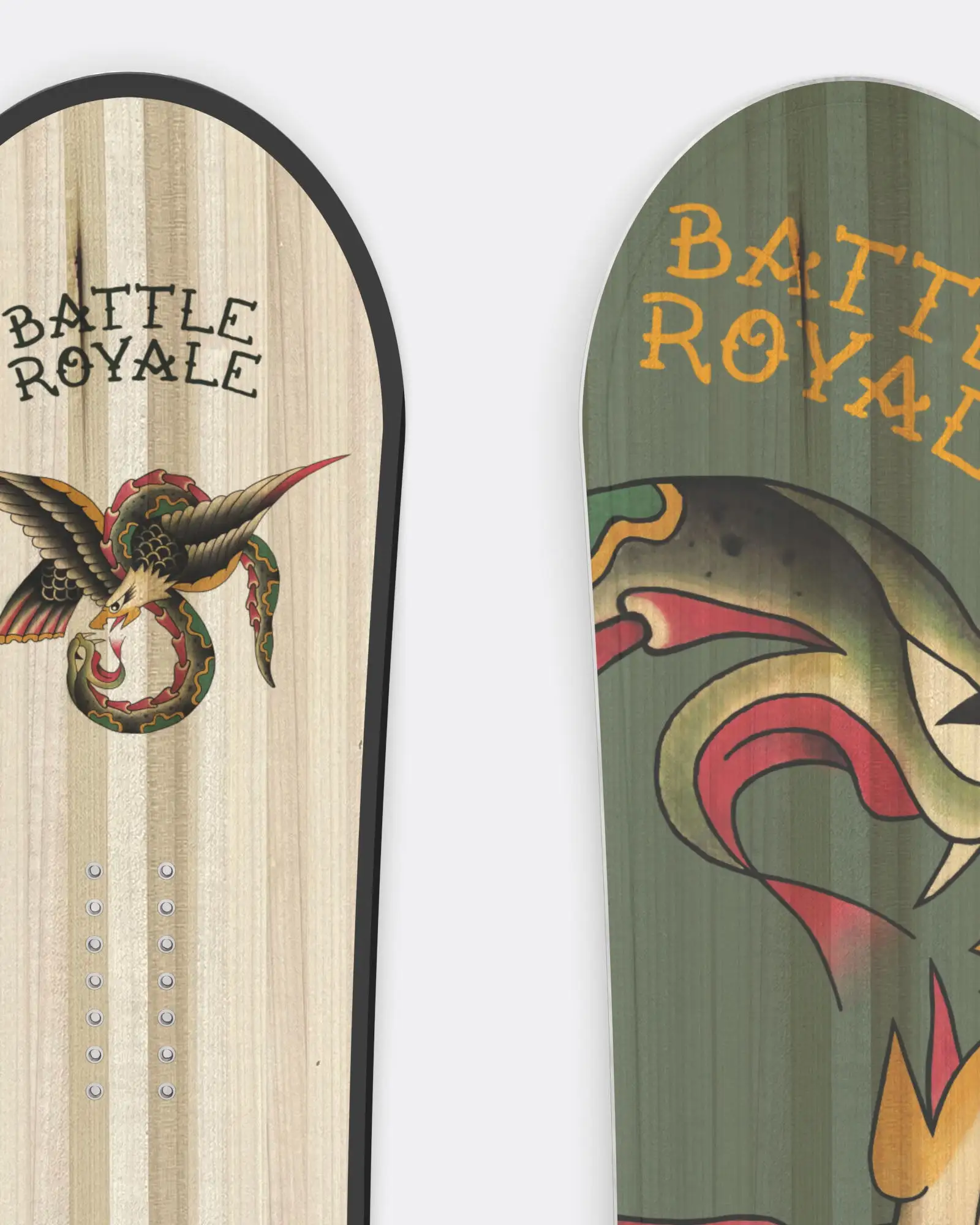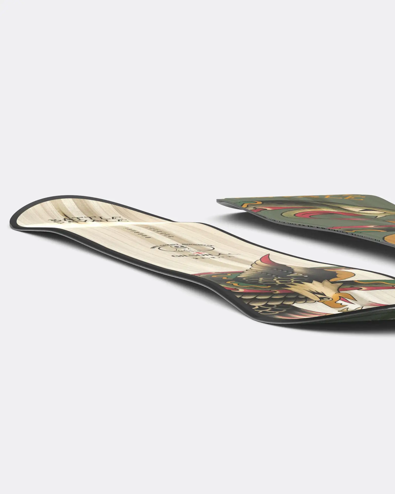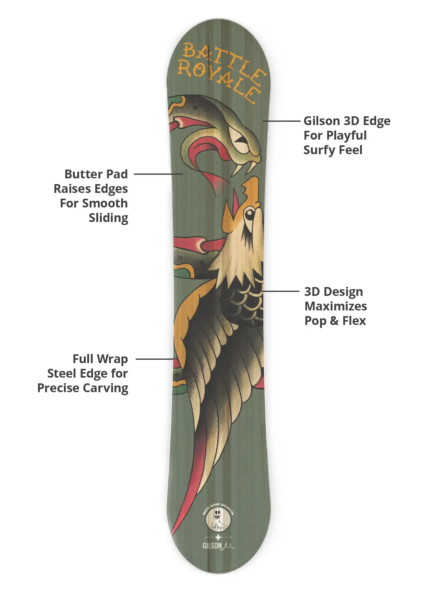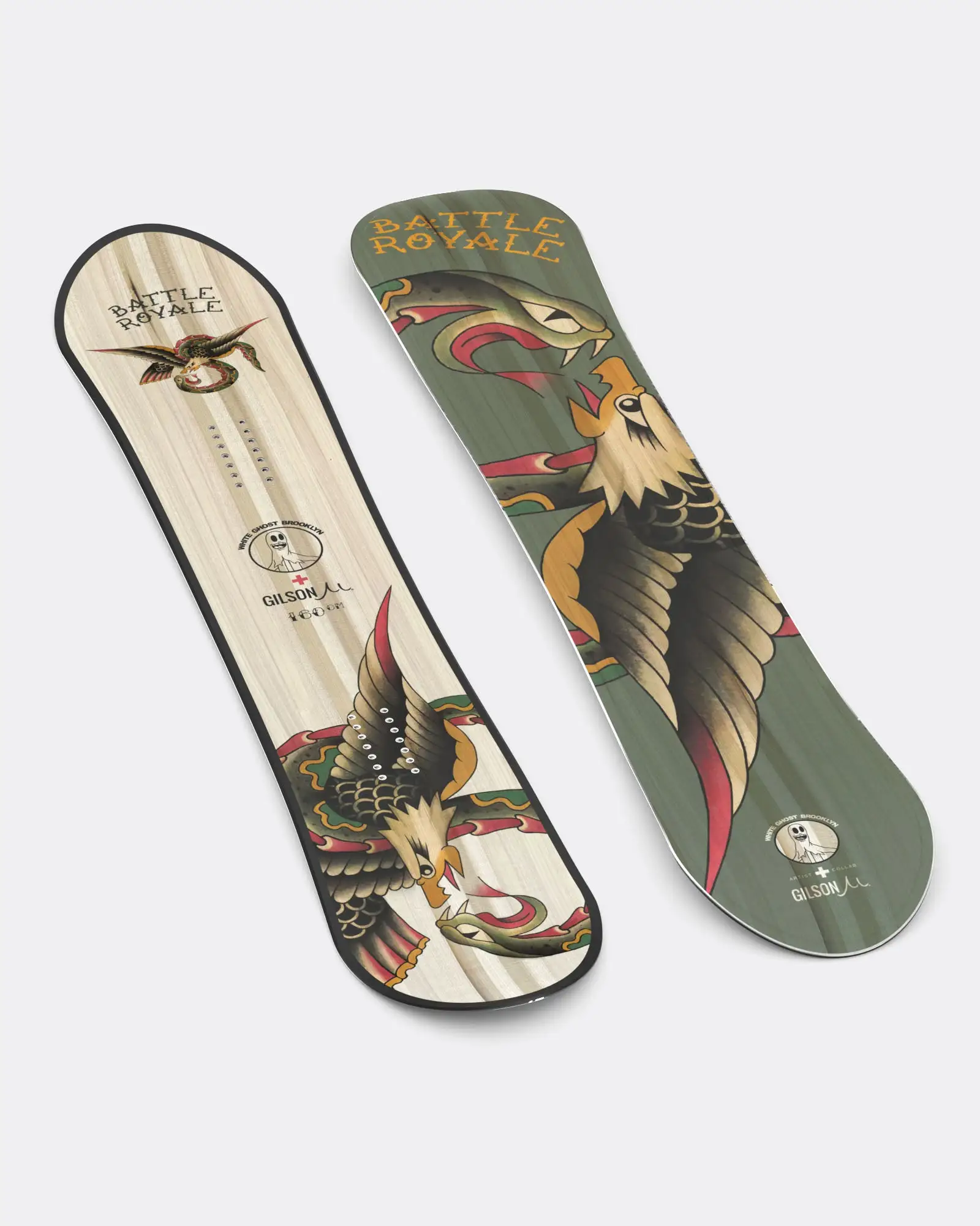 The Battle Royale Snowboard is a striking collaboration with Brooklyn tattoo artist White Ghost, featuring artwork inspired by centuries old tattoo tradition. With a fierce eagle and serpent locked in battle, this Limited Edition design symbolizes strength, balance, and grit. Built on GILSON’s Hybrid Camber All Mountain model and backed by a 5 year warranty, it delivers smooth surfy performance across powder, groomers, and park laps.