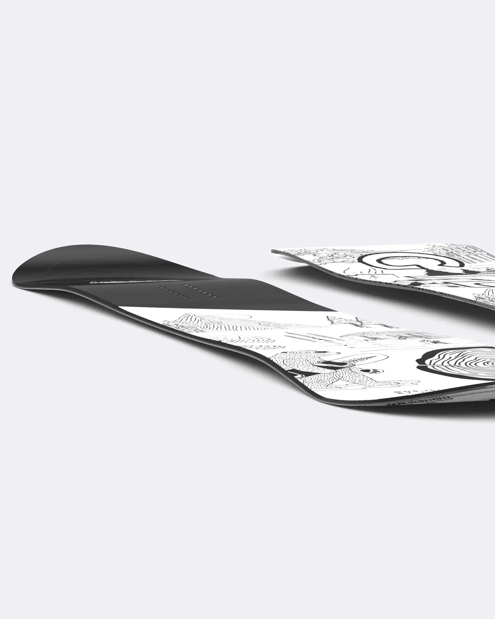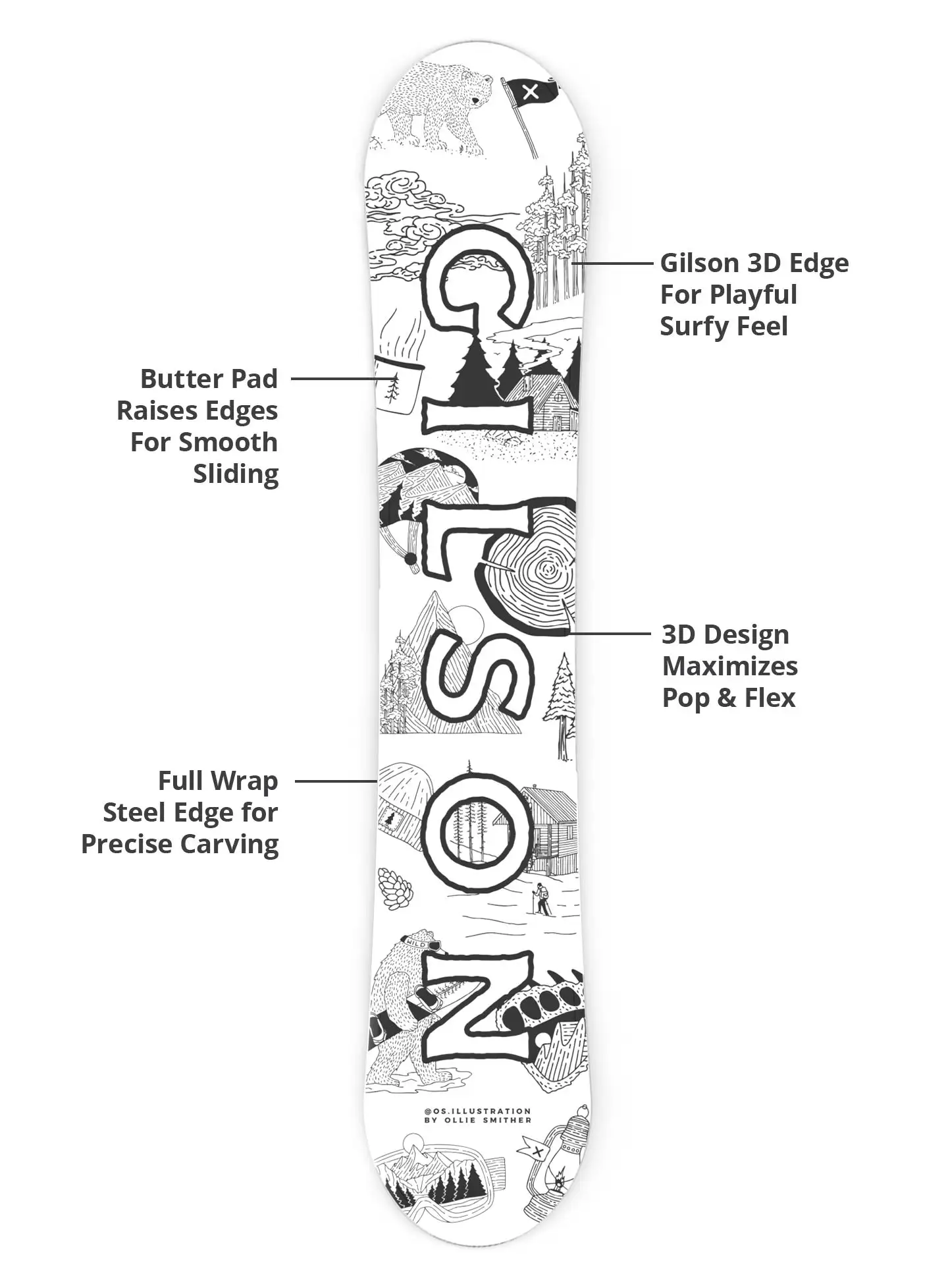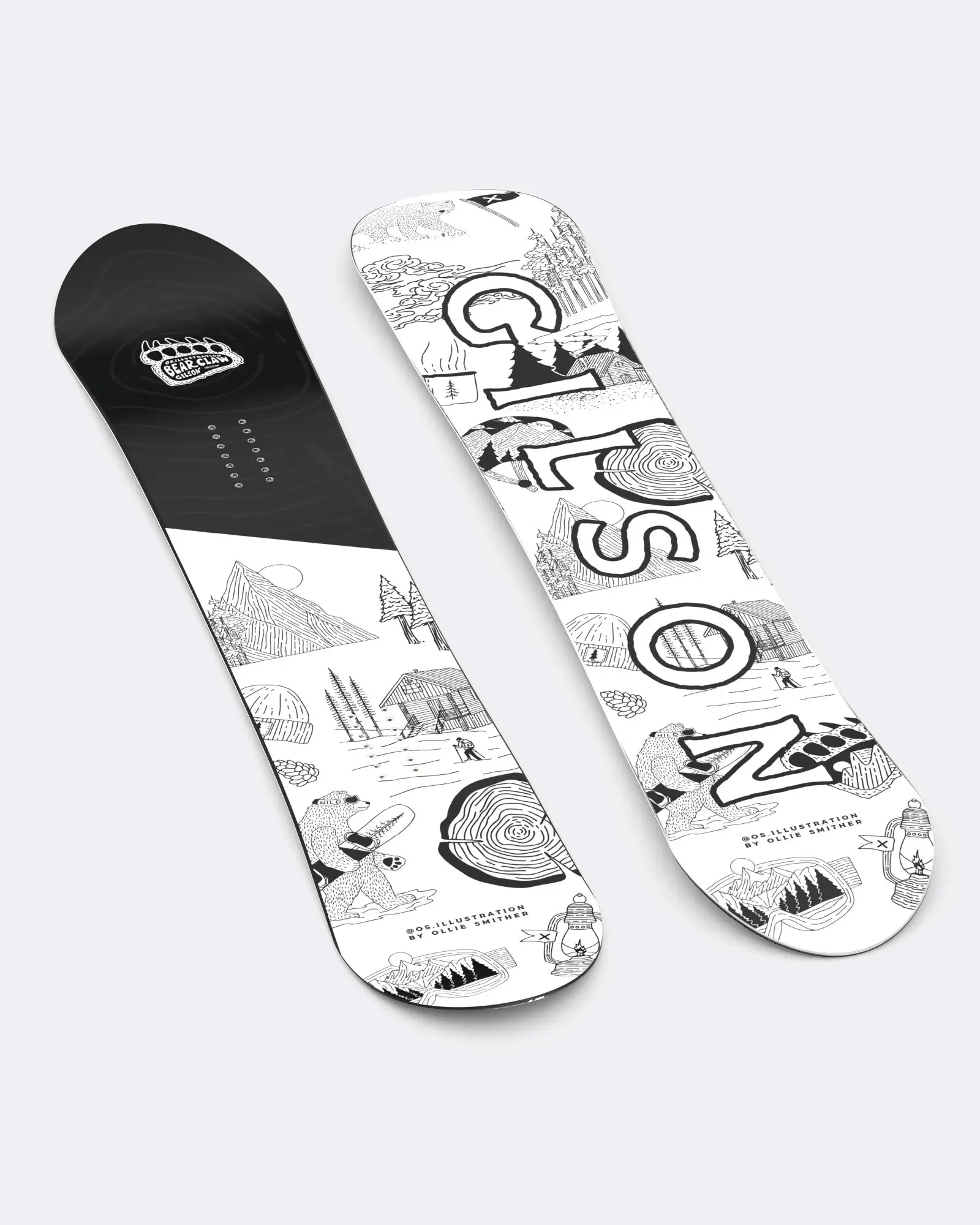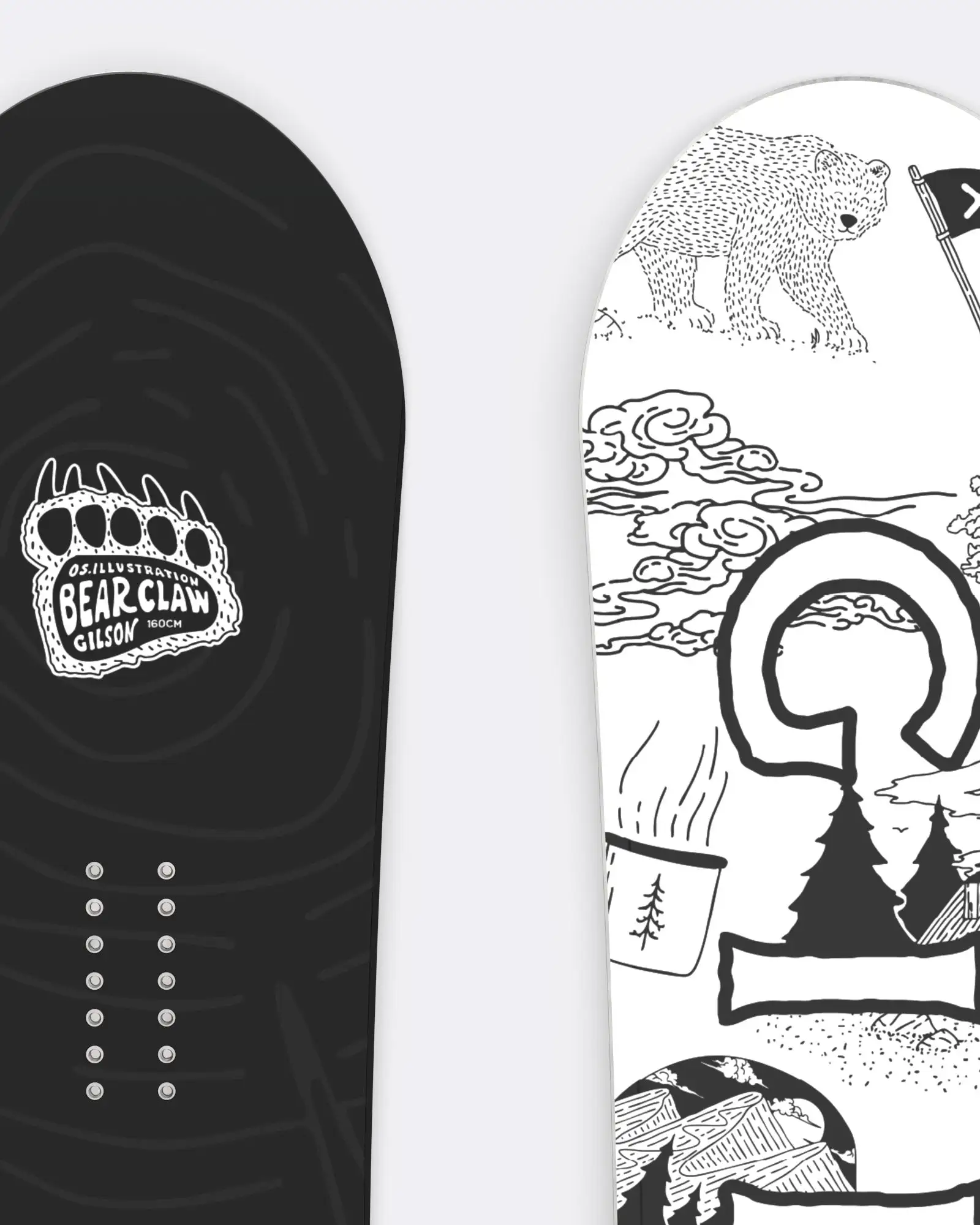 The Bear Claw Snowboard is a bold black and white collaboration with OS Illustrations, featuring Ollie’s intricate line work across the mountain landscape. With rugged cabins, forests, and adventurous bears, this Limited Edition deck blends playful storytelling with timeless design. Built on GILSON’s Hybrid Camber All Mountain model and backed by a 5 year warranty, it is crafted to ride everywhere from resort laps to backcountry lines.