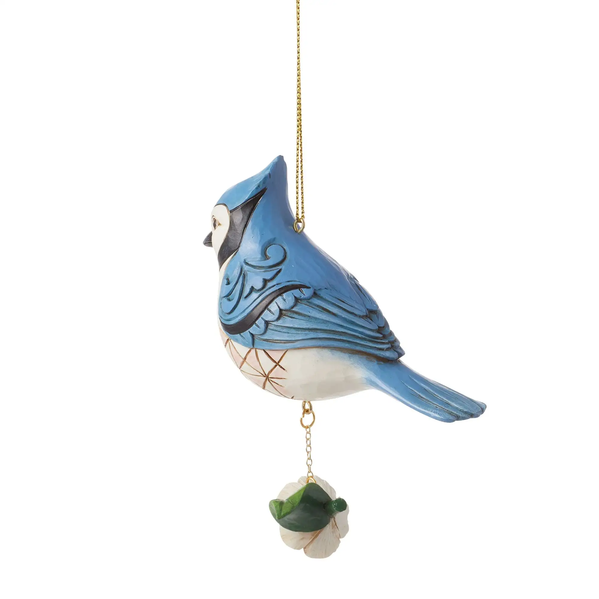 This lovingly crafted bird ornament by Jim Shore resembles a real Blue Jay. With the artist's iconic patchwork patterning and rosemaling, the beautiful bird perches on a flower as it hangs. Bring the magic of the outdoors in with this pretty piece.