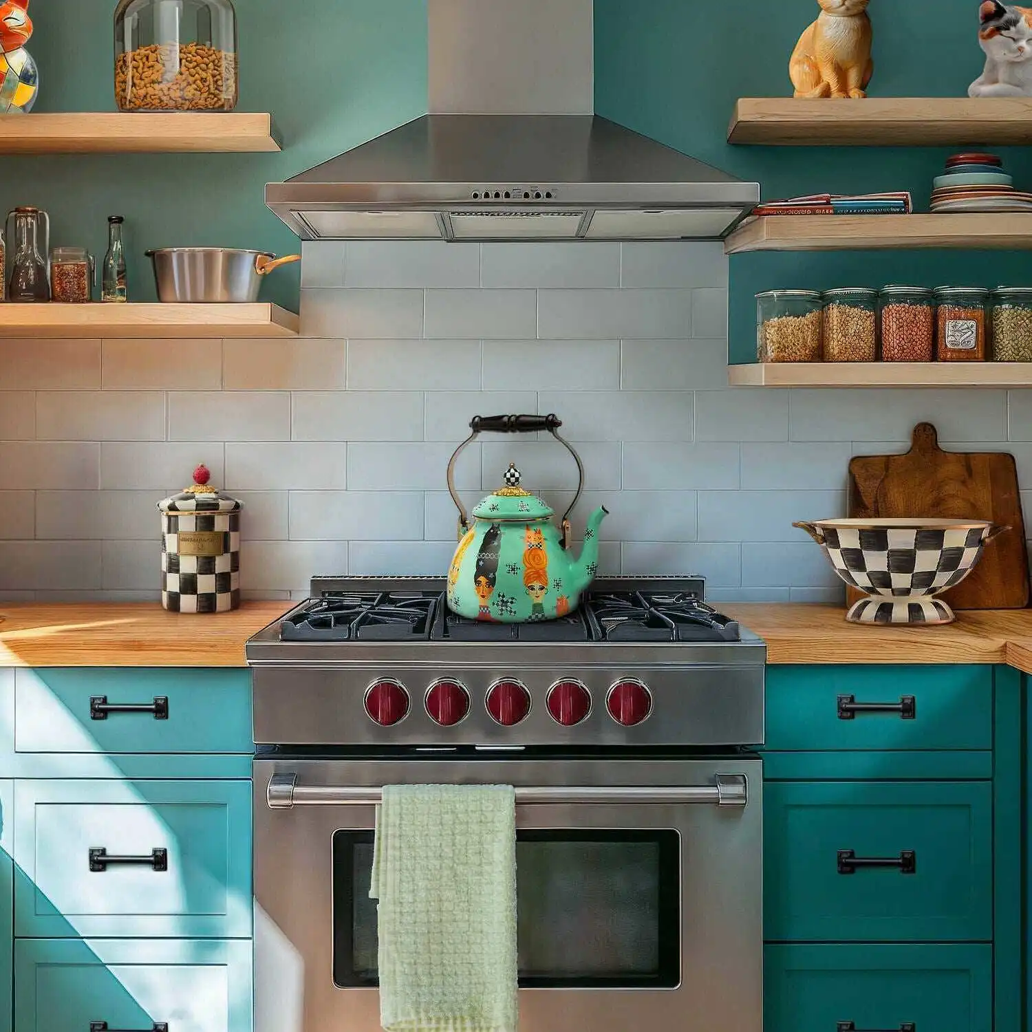 Suit your personali-tea with The Tea Kettle Collective. Strut your retro fashion flair with the Go Go 2 Quart Tea Kettle. It features bold and bright graphics from artist Bijou Karman on a heavy-gauge steel underbody, finished with a wood handle and a black and white check knob on the lid. Each special-edition Collective kettle makes a great cup of tea, of course, and adds MacKenzie-Childs style to your stovetop. Don’t be surprised that you need more than one.