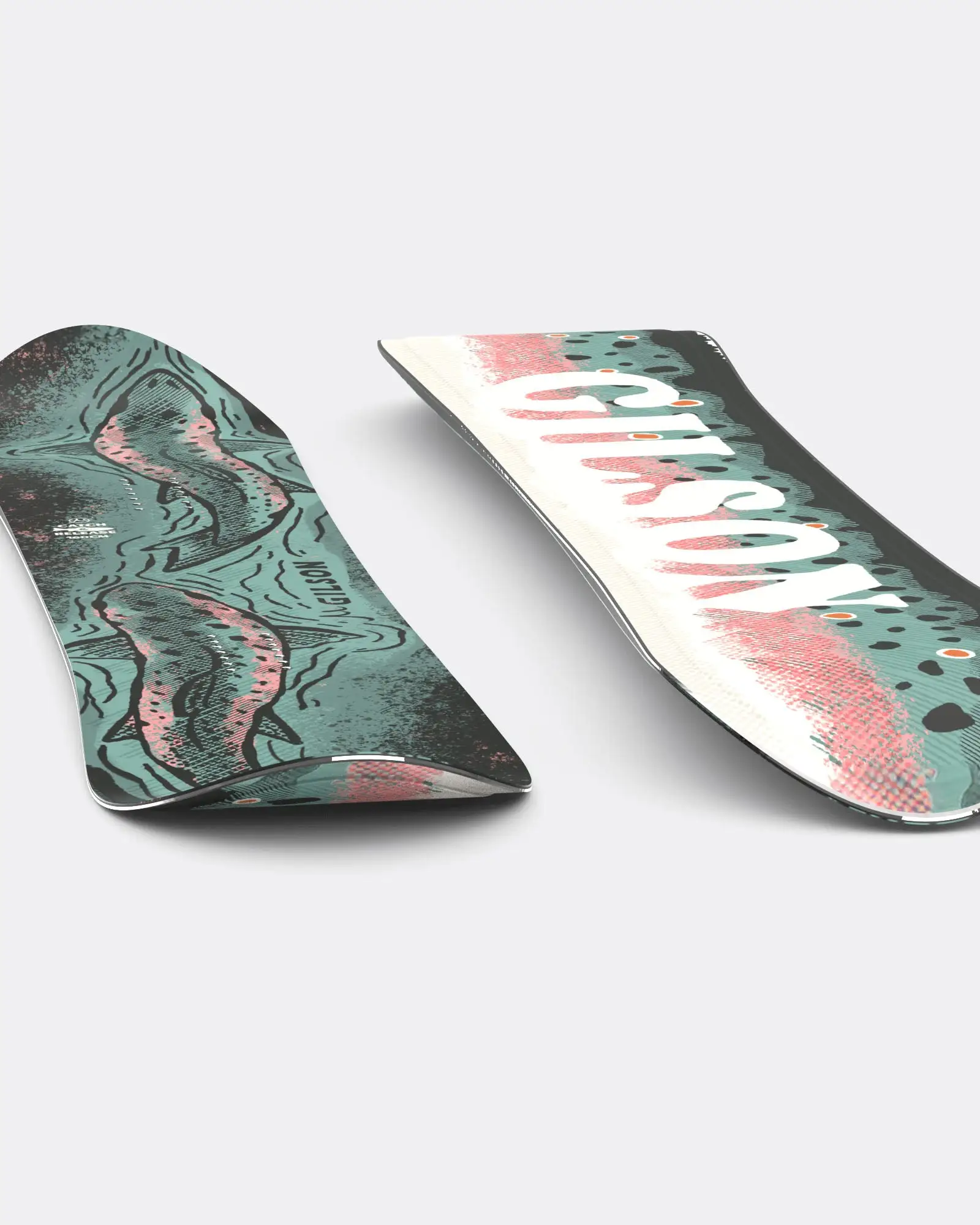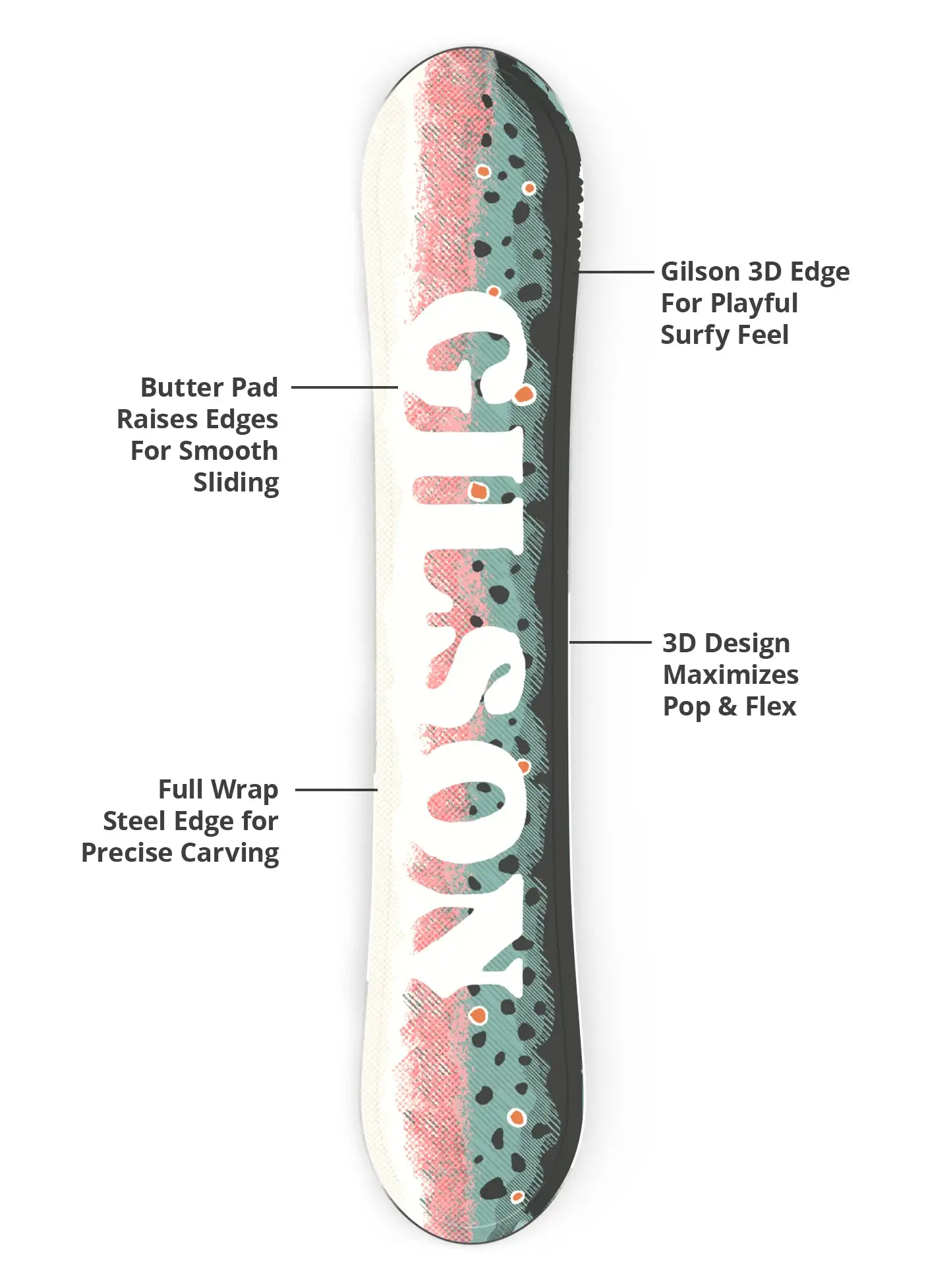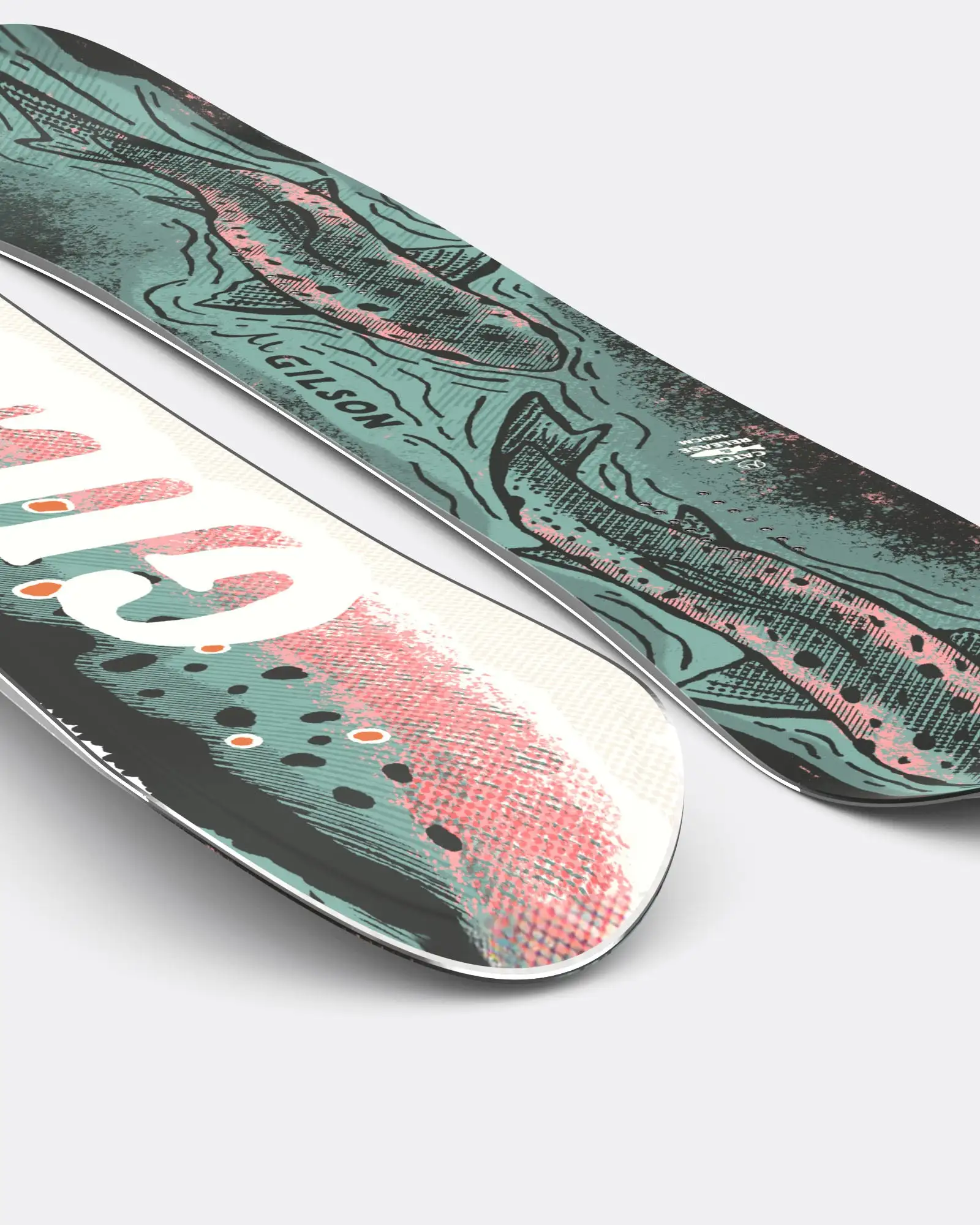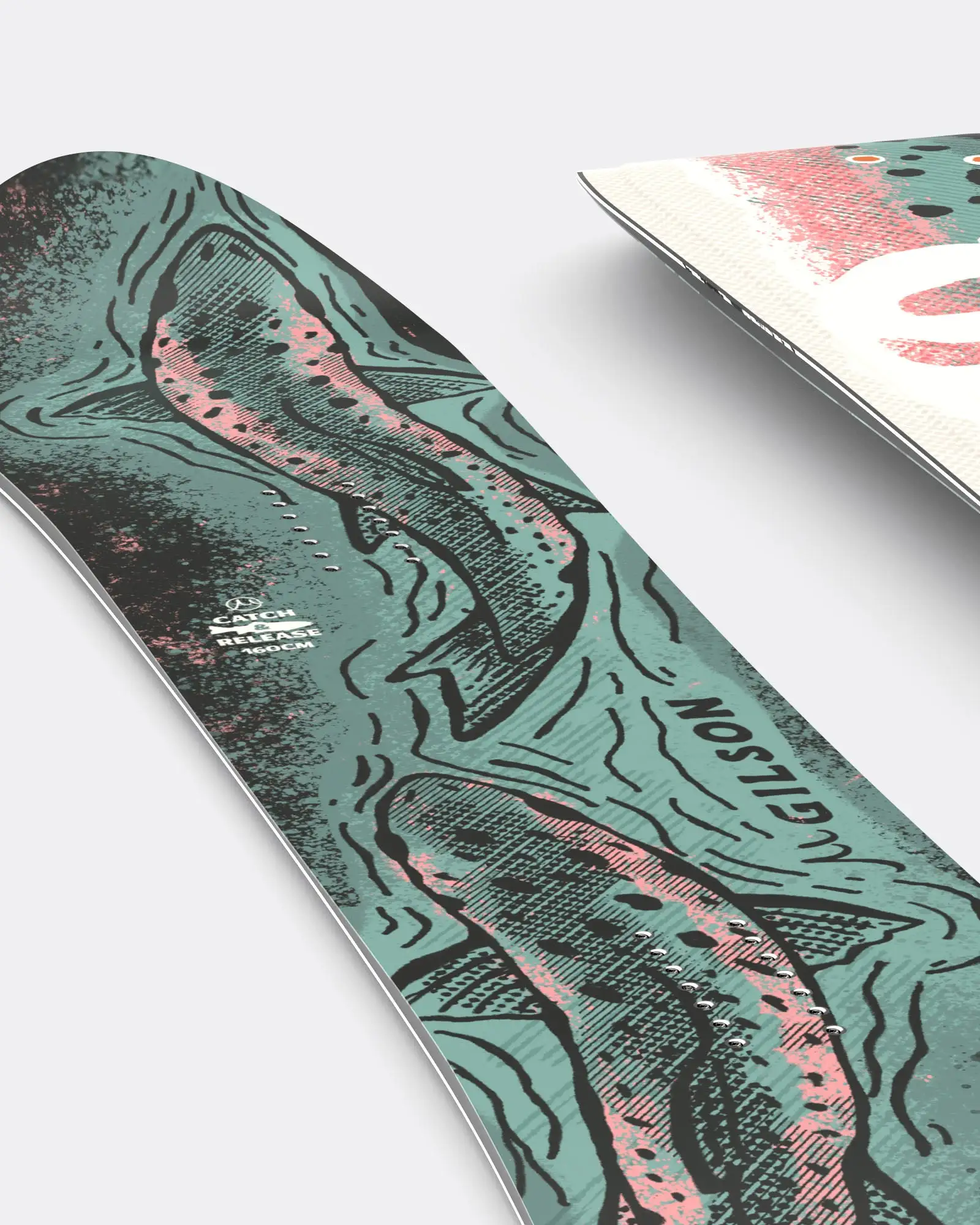 The Catch and Release Snowboard brings Huegel Design Co’s bold artwork to life with flowing trout graphics and river inspired textures. Built on GILSON’s Hybrid Camber All Mountain model, it delivers a smooth surfy ride ready for powder, groomers, and side hits. Handcrafted in Pennsylvania and backed by a 5 year warranty, this Limited Edition collab is made to stand out and built to last.