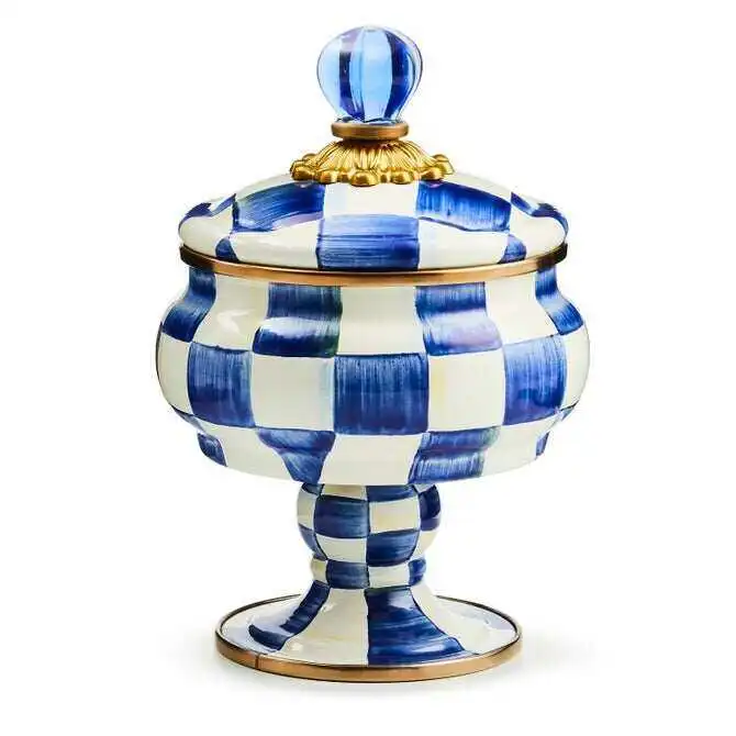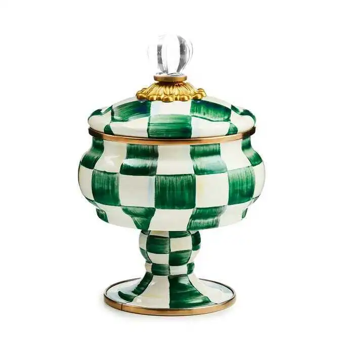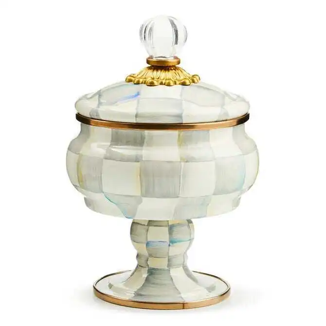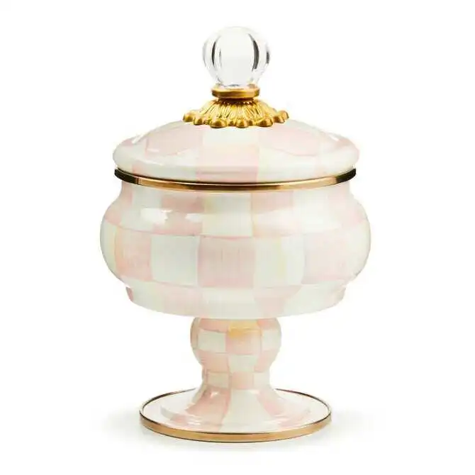 For housing treasured trinkets, there’s no container more charming than our Rosy Check® Curiosity Pot. The handsome curved pot with a perfectly matched pedestal is dressed in our checks hand-painted in a range of rosy hues and topped off with a lid featuring a clear glass knob.