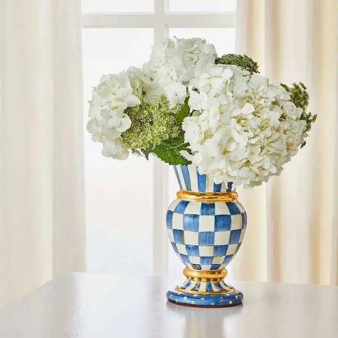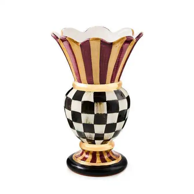 Royal Check: Great lines. Great gift. Our handcrafted ceramic Royal Check Great Vase—mixing color-dragged Royal Checks, vibrant stripes, and gold lustre accents—is hand-painted by our artisans here in Aurora, New York. Turn it over and you’ll see the stamps of each of the artisans who had a hand in its creation. Generously sized for an impressive presentation.