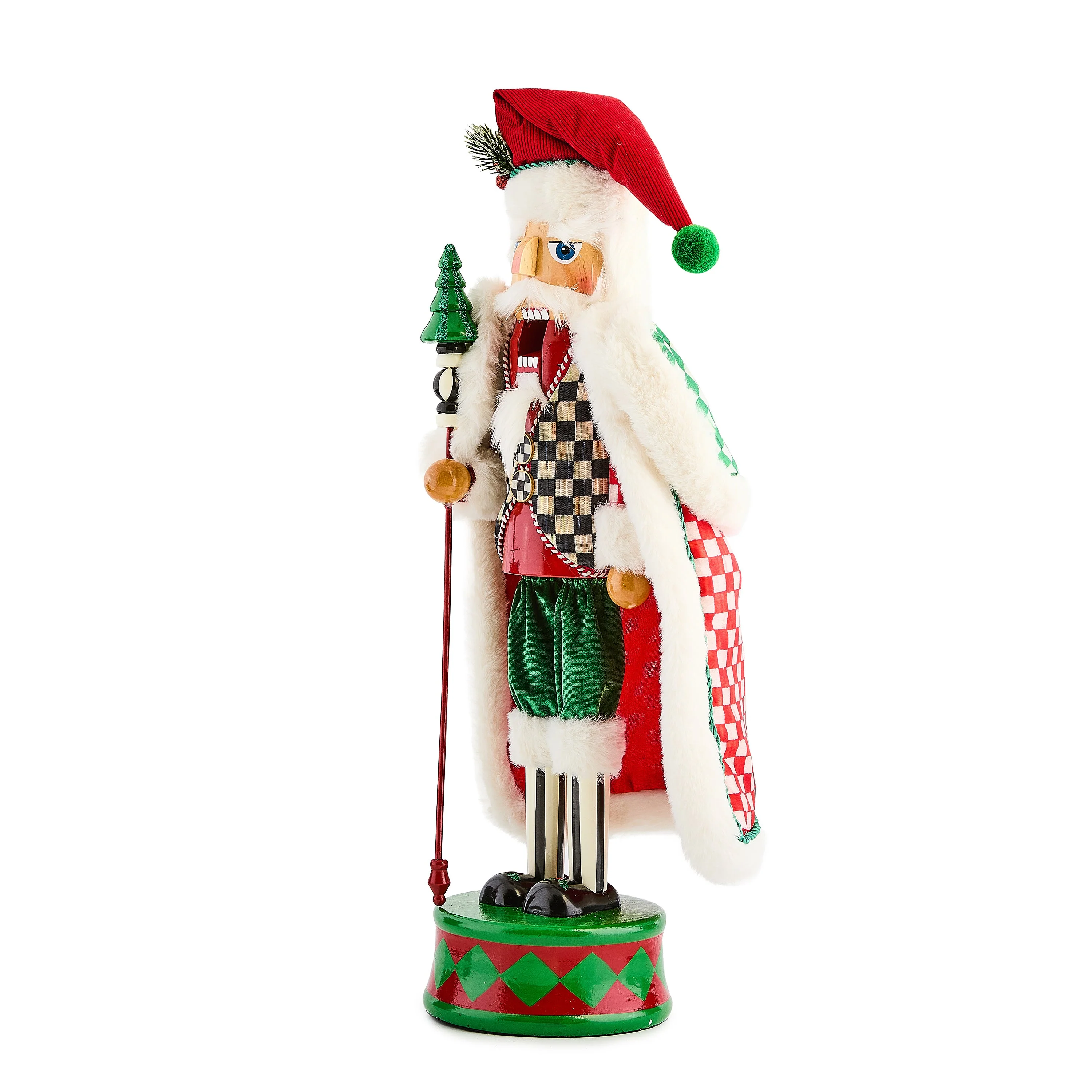 Add MacKenzie-Childs signature charm to your Christmas season with the Check It Out Nutcracker. We¡¯ve reimagined this classic decoration in an iconic Courtly Check patterned vest and red check fur-lined cape. Beautiful on an end table or on your holiday mantel alongside your stockings.