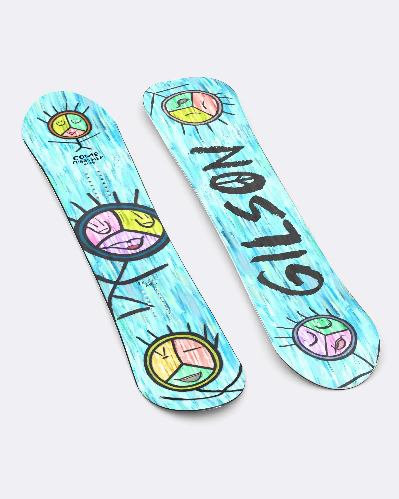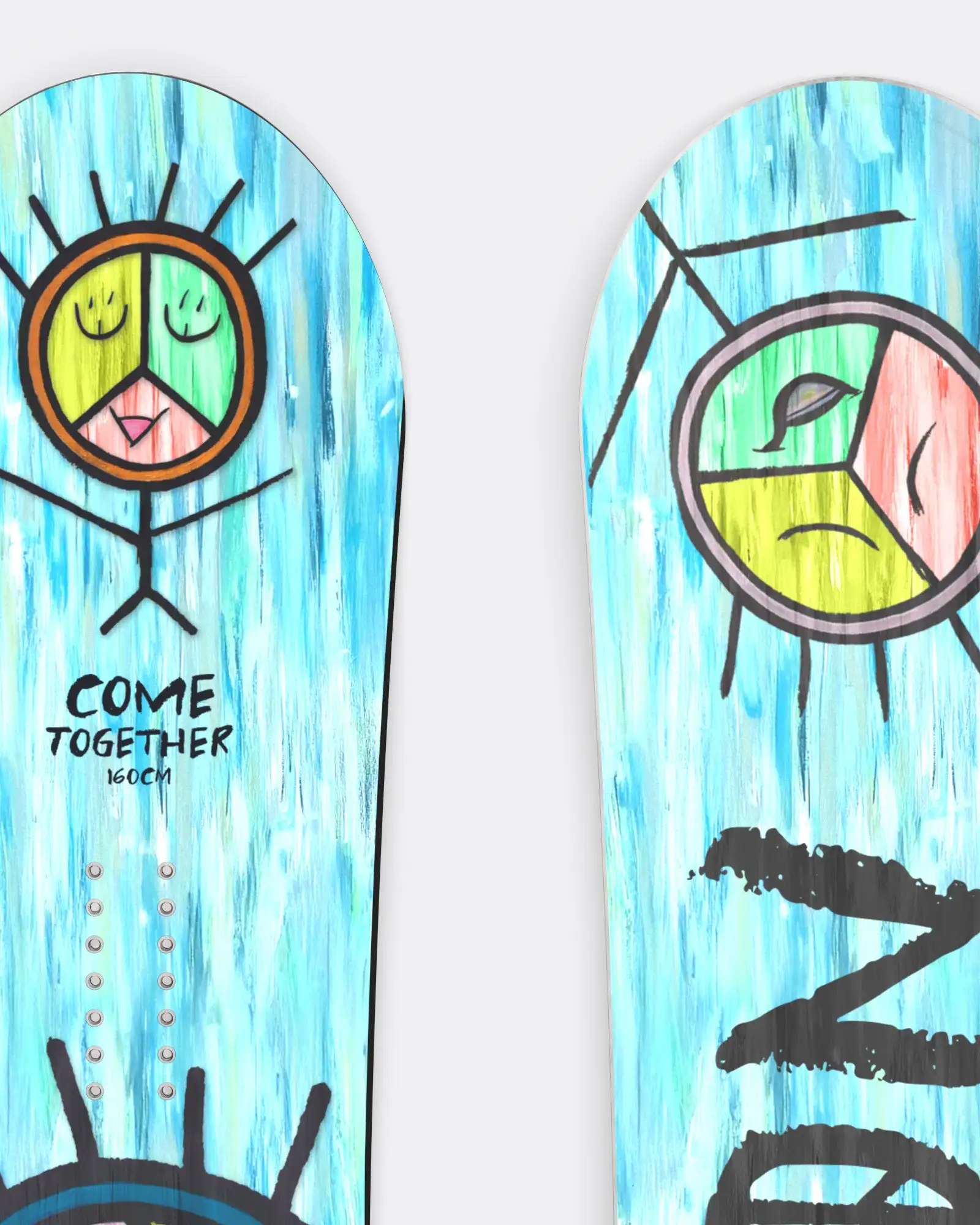 Come Together is a bold celebration of peace, love, and unity. Featuring abstract, Artie’s signature graffiti-style peace sign characters, this board reminds us that we’re stronger together than apart. It’s playful, powerful, and rooted in the belief that spreading joy and kindness matters — on the mountain and beyond. In a world that often feels divided, Come Together stands as a symbol: carve turns, crush powder, and carry peace with you wherever you ride.