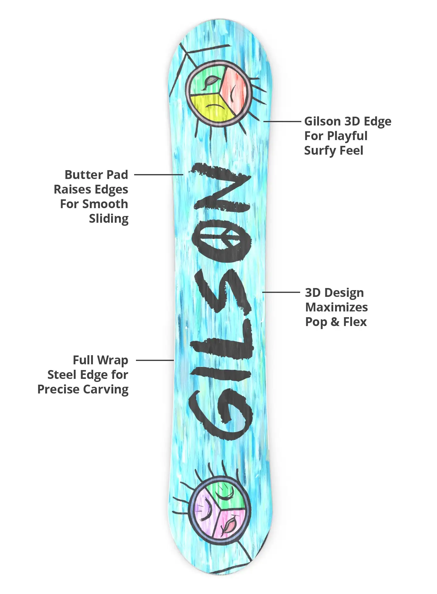Built on GILSON’s Hybrid Camber All Mountain model and backed by a 5 year warranty, it delivers smooth surfy performance across powder, groomers, and side hits.