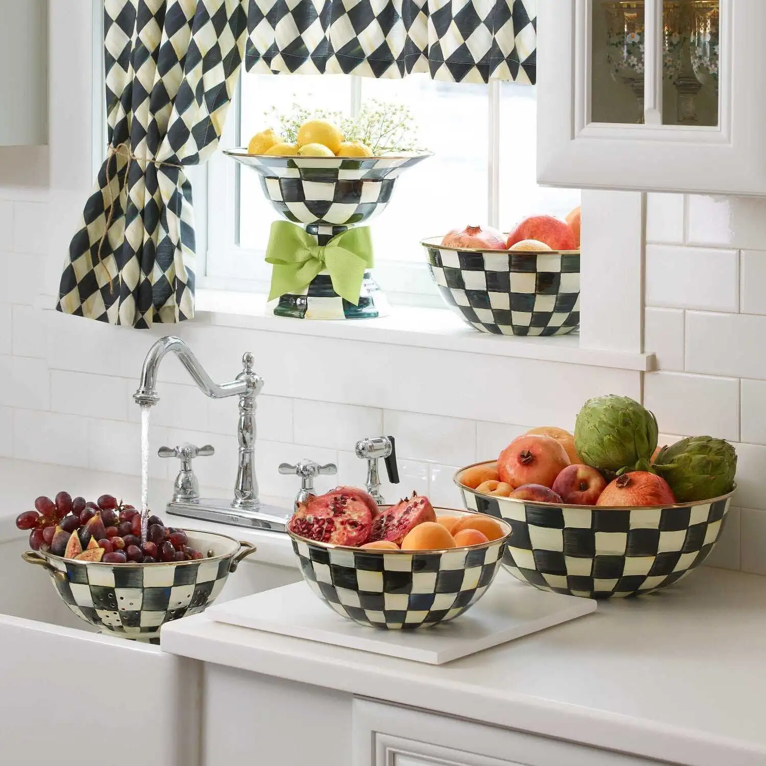 Heavy-gauge, hand-glazed steel underbody with hand-painted Courtly Checks, rimmed in bronzed stainless steel. Pieces may vary due to the handmade nature of each product.?