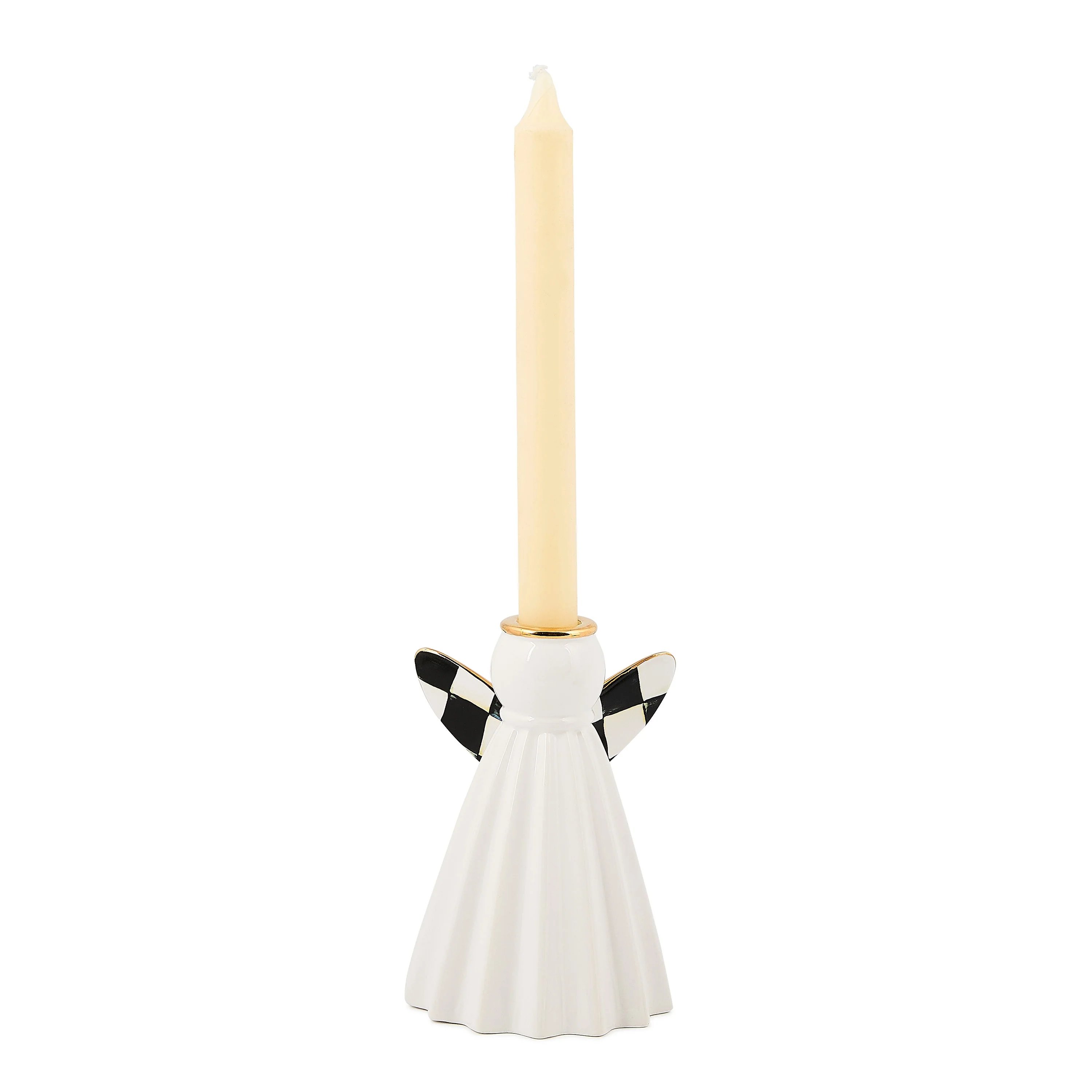 For the perfect mix of glam and classic Christmas style, look no further than the Courtly Noel Short Ceramic Angel Candle Holder. The simple silhouette features a white ceramic angel with Courtly Checked wings, perfect for holding dinner candles. Beautiful on an end table for a festive display or as a centerpiece for the Christmas dinner table.