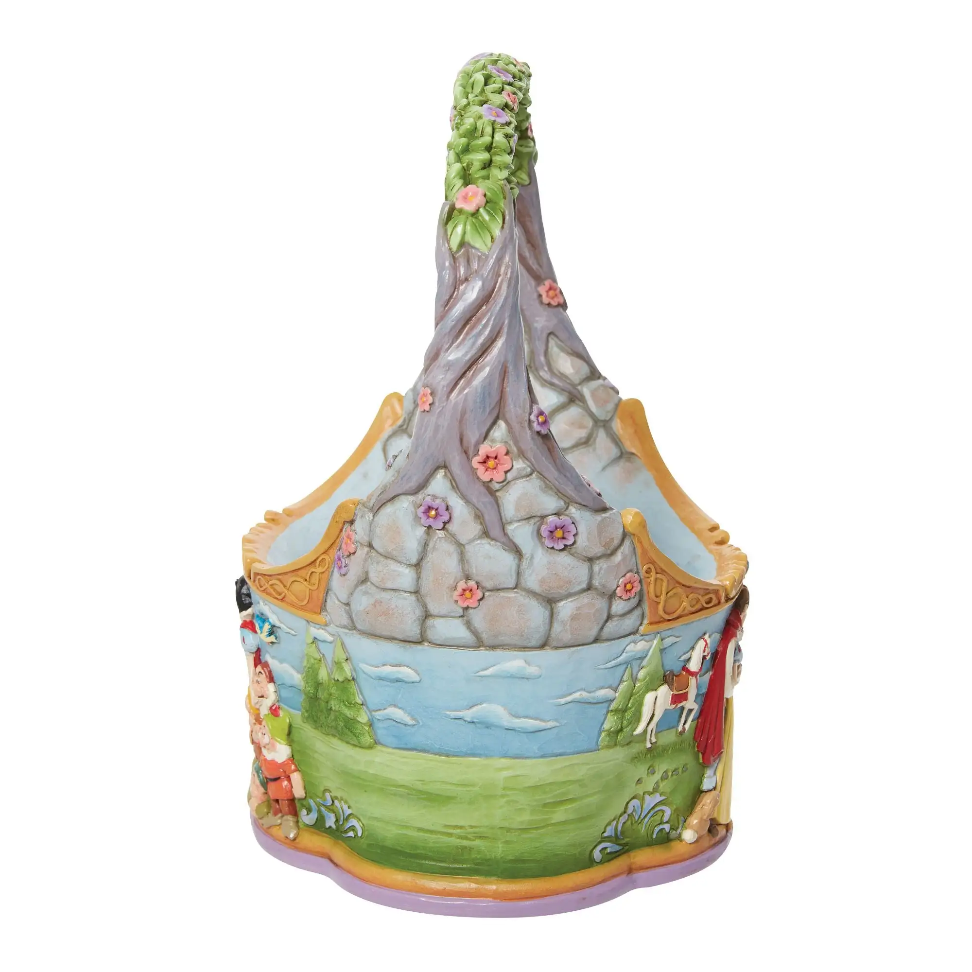In honor of the 85th anniversary of Snow White and the Seven Dwarfs, Jim Shore crafts a dazzling two sided Easter basket with 3 eggs featuring the beloved characters in intricate detail and color.