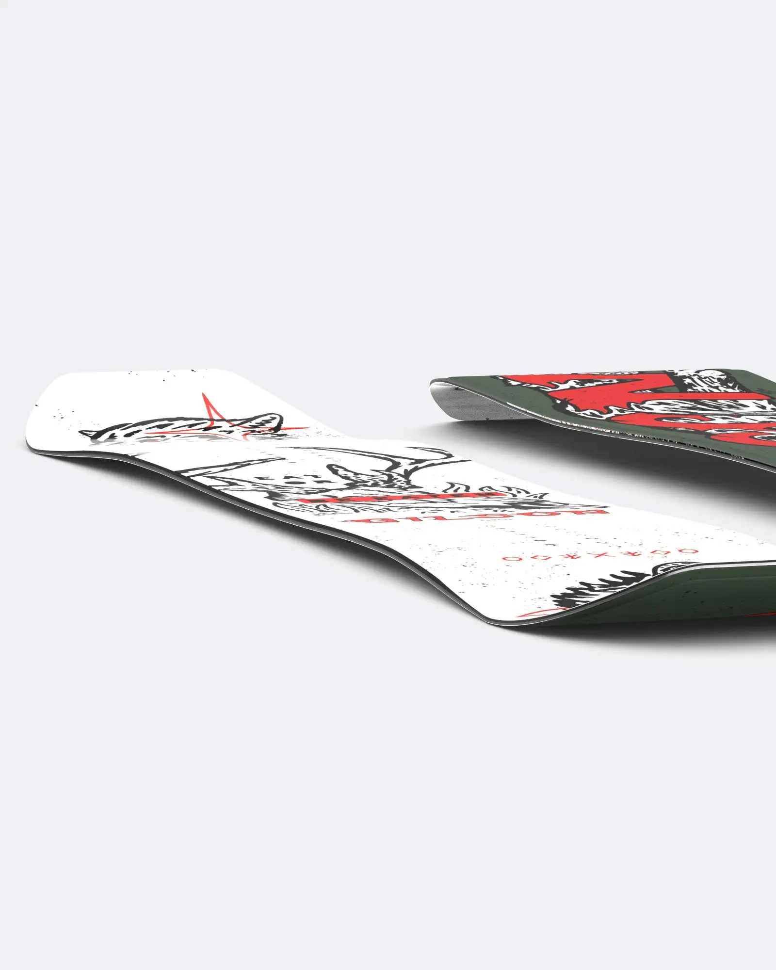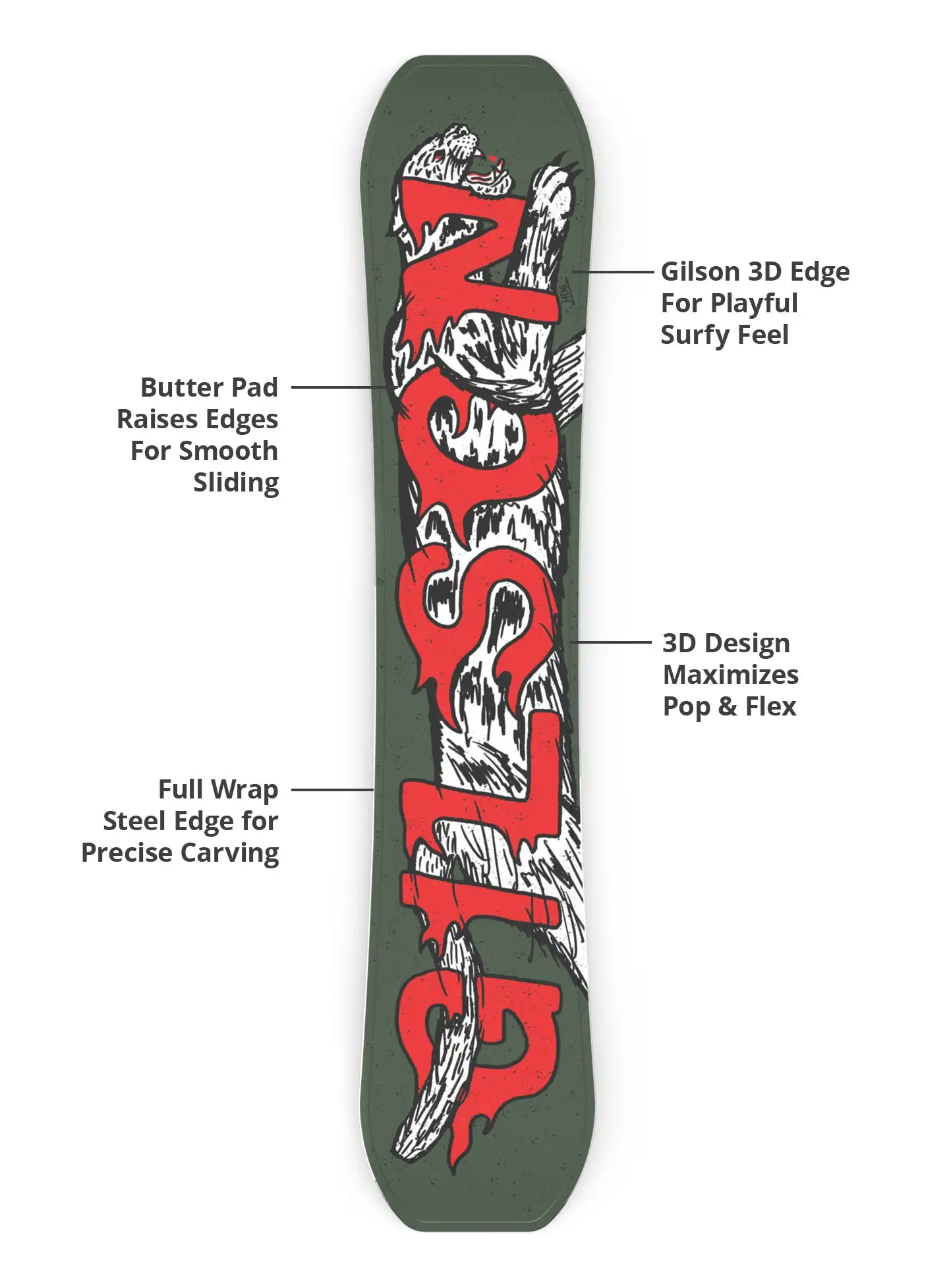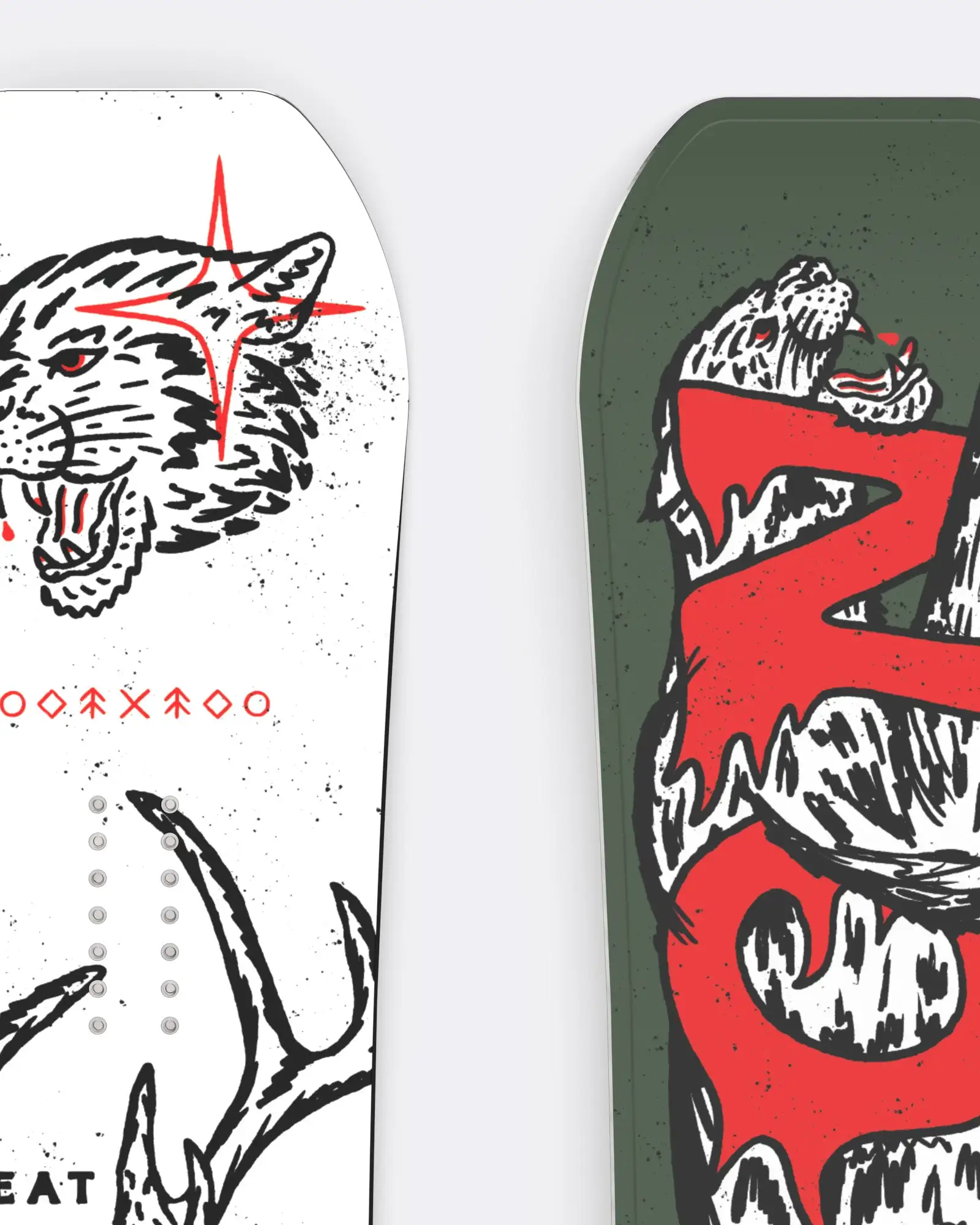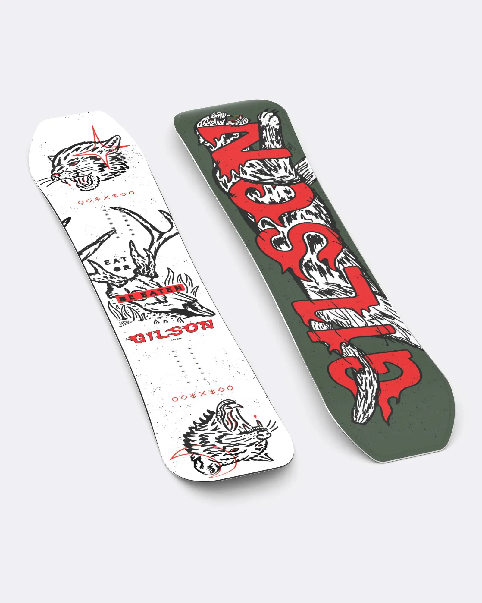 The Eat or Be Eaten snowboard is a powerful collaboration with Doug Huegel, showcasing his raw, nature-driven artwork in a design that commands attention. Built on Gilson’s best-selling Hybrid Camber Freestyle model, this board delivers the perfect balance of playfulness and precision. Whether you’re in the park, carving groomers, or chasing natural hits across the mountain, Eat or Be Eaten heightens your senses and challenges you to trust your instincts on every run.