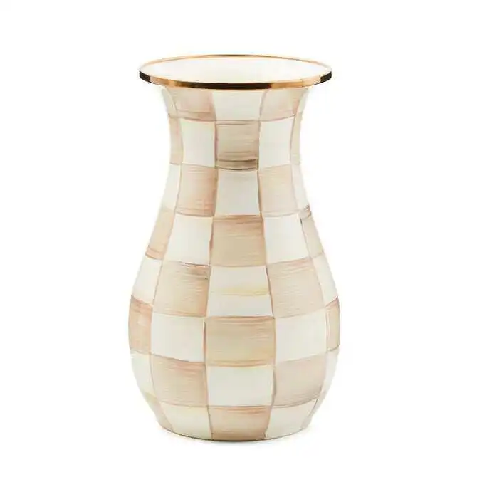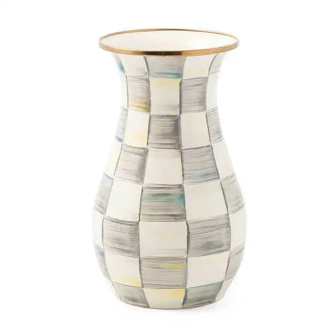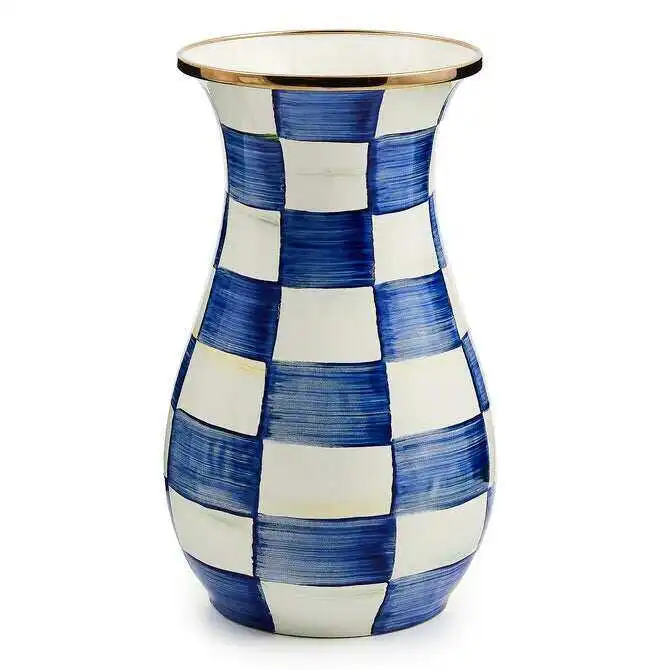 Royal Check: Farm-fresh and inspired by traditional glass milk jugs, the Tall Royal Check Vase is the kind of vase that’s just right for a casual wildflower bouquet, cherry-blossom branches or pussywillow stalks. It's made of hand decorated enameled steel, with a bronzed rim.