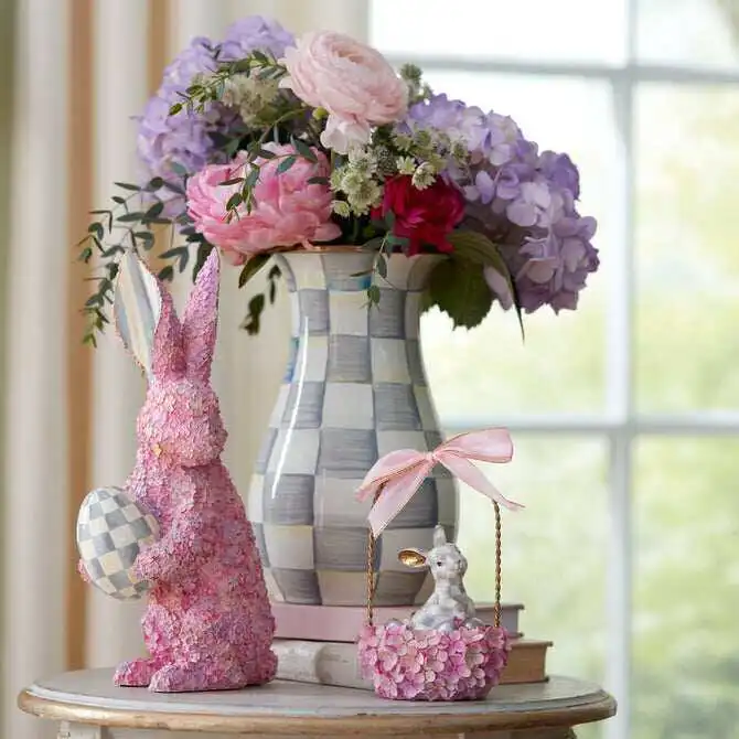 Mocha Check: Farm-fresh and inspired by traditional glass milk jugs, the Mocha Check Tall Vase is the kind of vase that’s just right for a casual wildflower bouquet, cherry-blossom branches or pussywillow stalks. It’s made of hand decorated enameled steel, decorated with hand-painted, coffee-colored checks, and trimmed with a bronzed rim.
