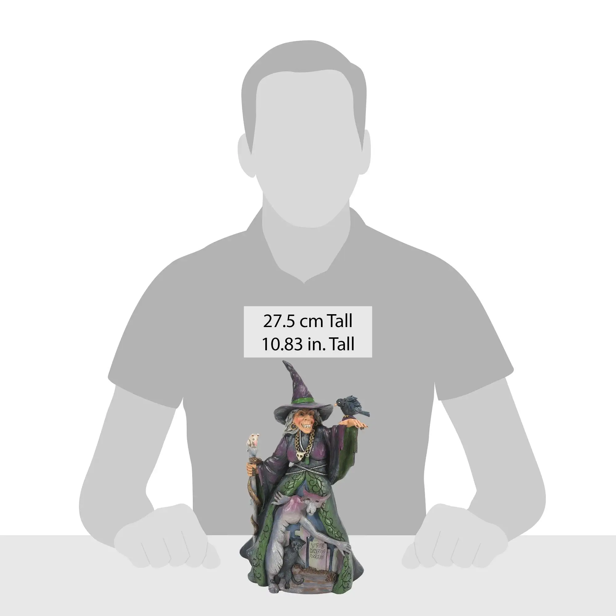 Enter the enchanting world of Halloween with this haunting Jim Shore witch figurine, adorned in ghastly purple and green robes, a perched crow and a staff with a slithering snake. Her cloak reveals a chilling graveyard scene with a spook and a black cat