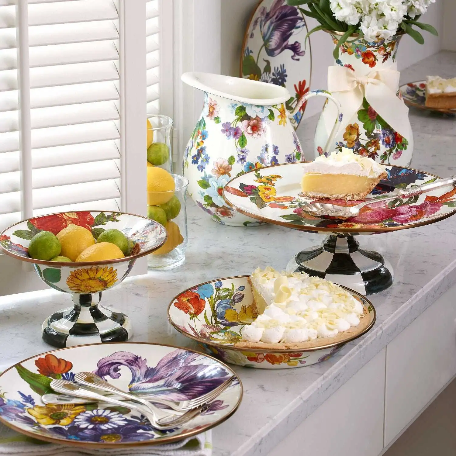 Each White Flower Market Small Compote is color-glazed and decorated with hand-applied fanciful botanical transfers that recall a lush English garden in the peak of summer. Hand-painted Courtly Check? base.
