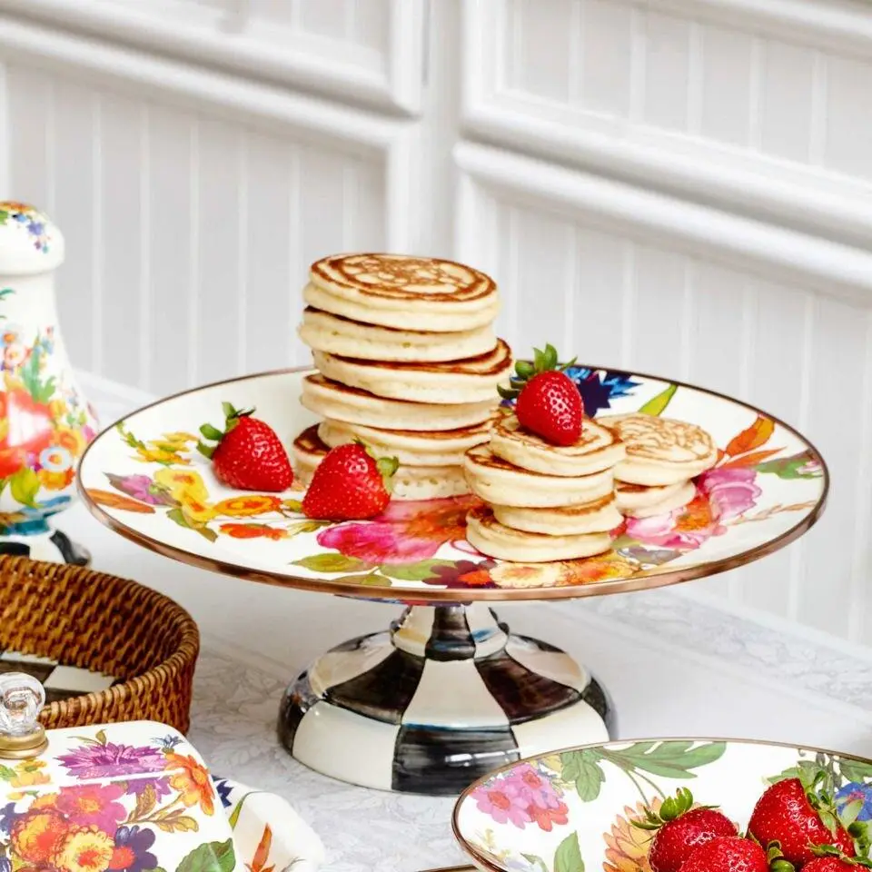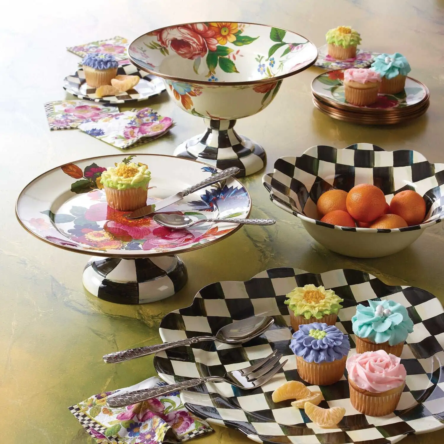 Our Flower Market Enamel Small Pedestal Platter is certain to be the center of attention at every gathering. The color-glazed serving dish is decorated with hand-applied fanciful botanical transfers that recall a lush English garden in the peak of summer, and accented with a hand-painted Courtly Check? base for a stunning, elevated presentation.