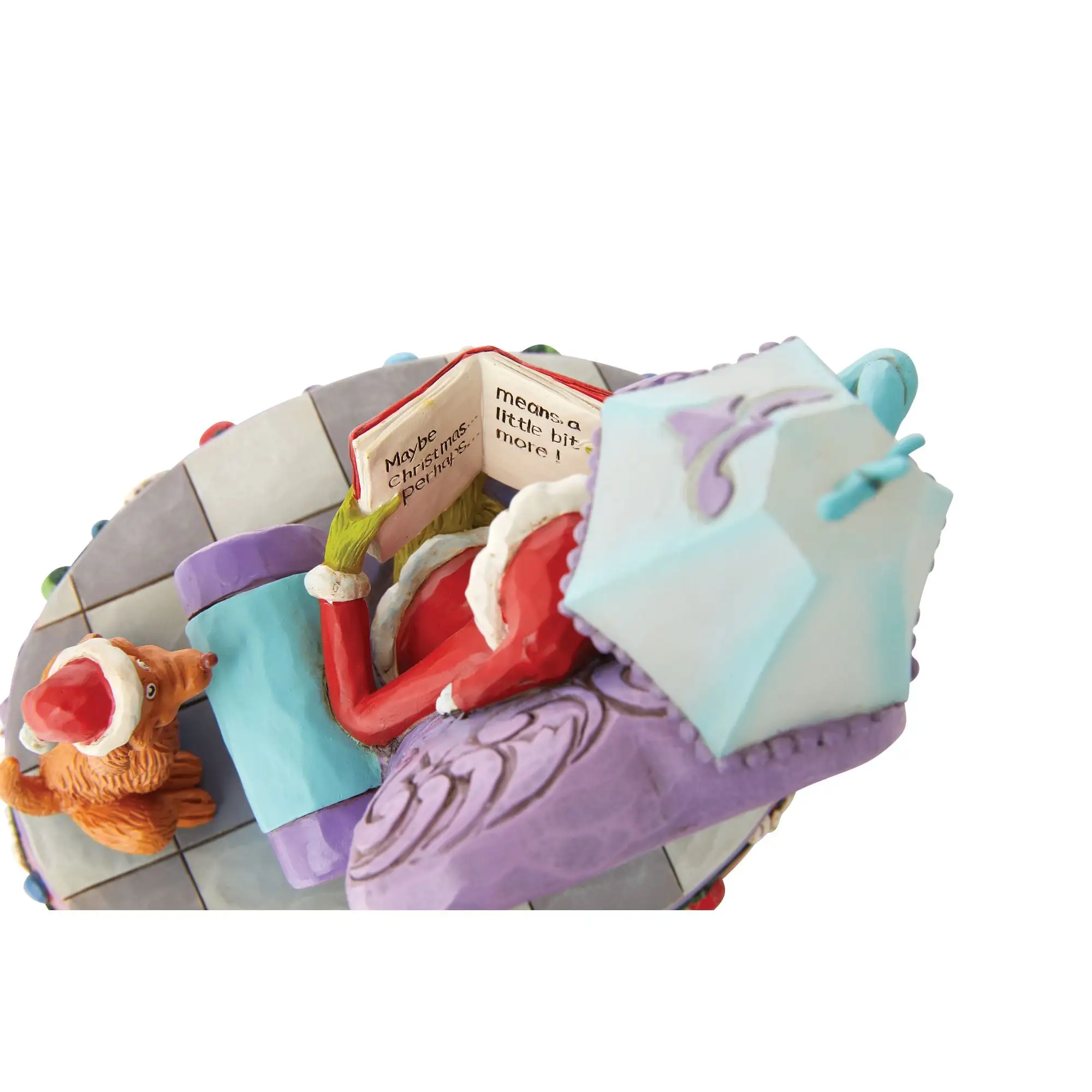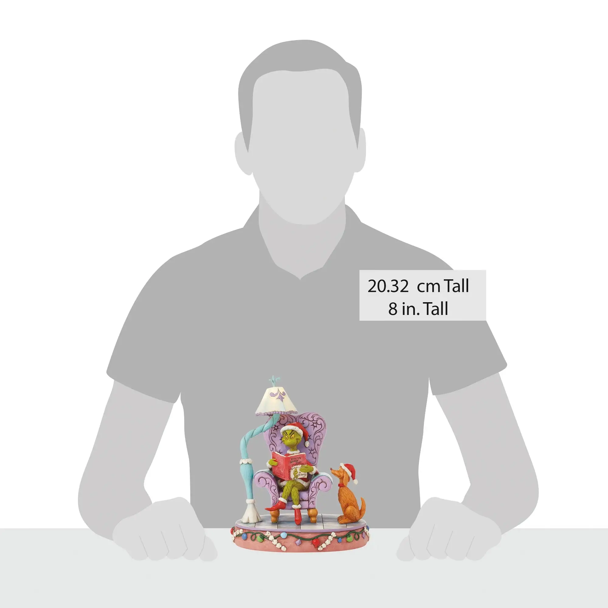This Jim Shore creation features The Grinch reading in a large rosemale blue and purple chair. With a light-up lamp, Grinch reads his Dr. Seuss book dressed as Santa. His loyal dog, Max, sits by his side. Enjoy Christmas with this classic character!