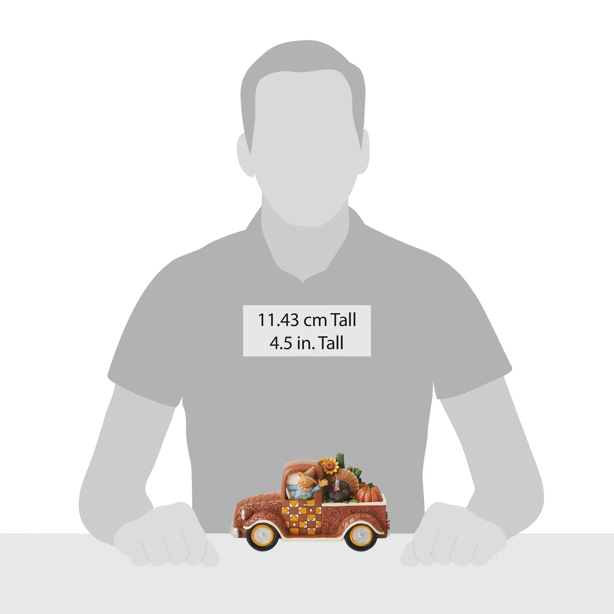 Waving cheerfully, a smiling scarecrow steers a fantastically patterned orange pickup truck towards Fall fun. With a truckload of Autumn harvesting, sunflowers, apples, and pumpkins are out for delivery. This Jim Shore truck is a charmer.