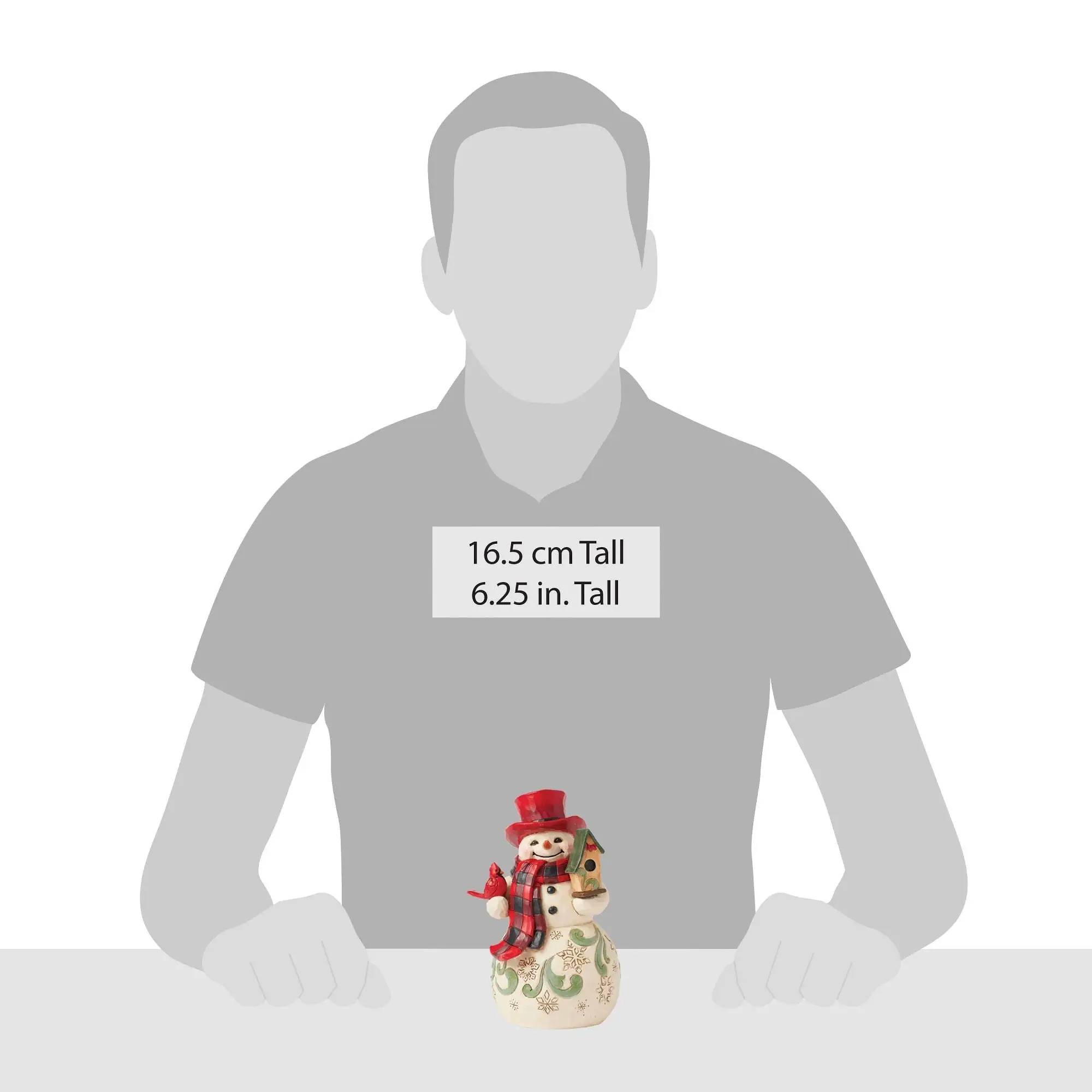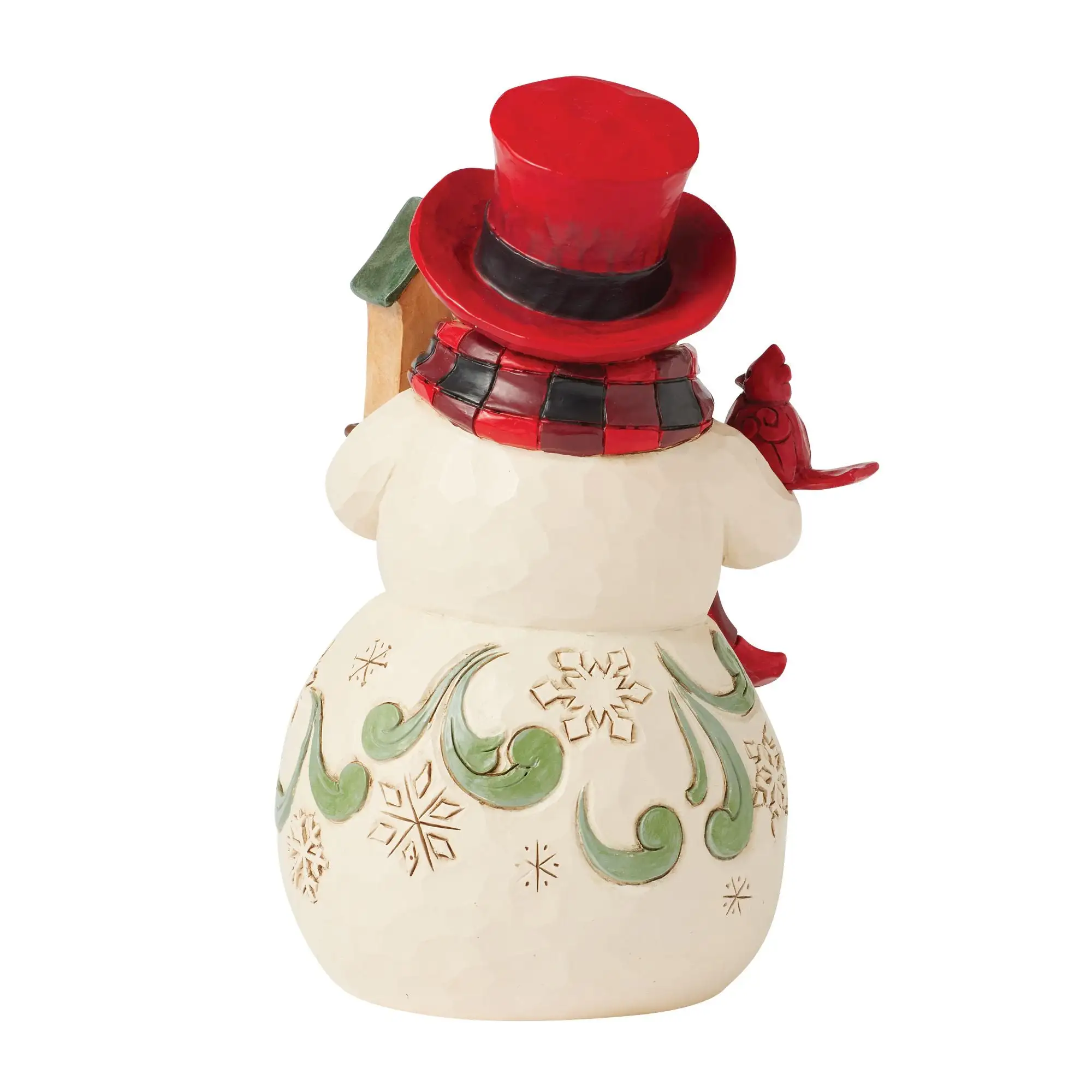 This whimsical Jim Shore Highland Glen snowman wears a cozy buffalo plaid scarf and a vibrant red top hat. Holding a charming birdhouse with a friendly cardinal perched beside him, his joyful smile radiates warmth and holiday spirit.
