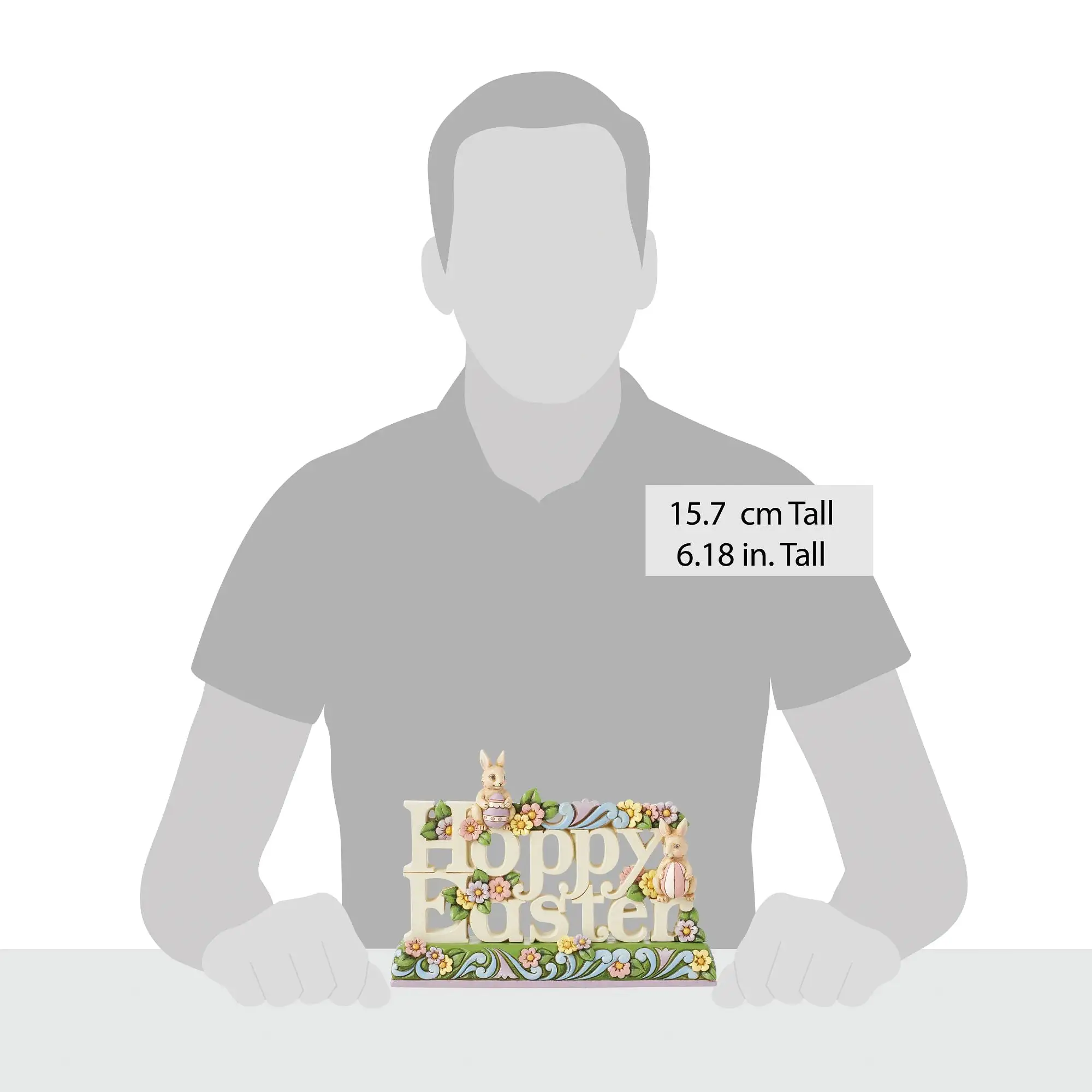 This colorful sign is a charming addition to your holiday home decor. With a kaleidoscope of flowers and two cheerful bunnies with painted eggs, this Easter text figurine by Jim Shore wishes you a "Hoppy Easter" with vibrant petals and rosemaling.