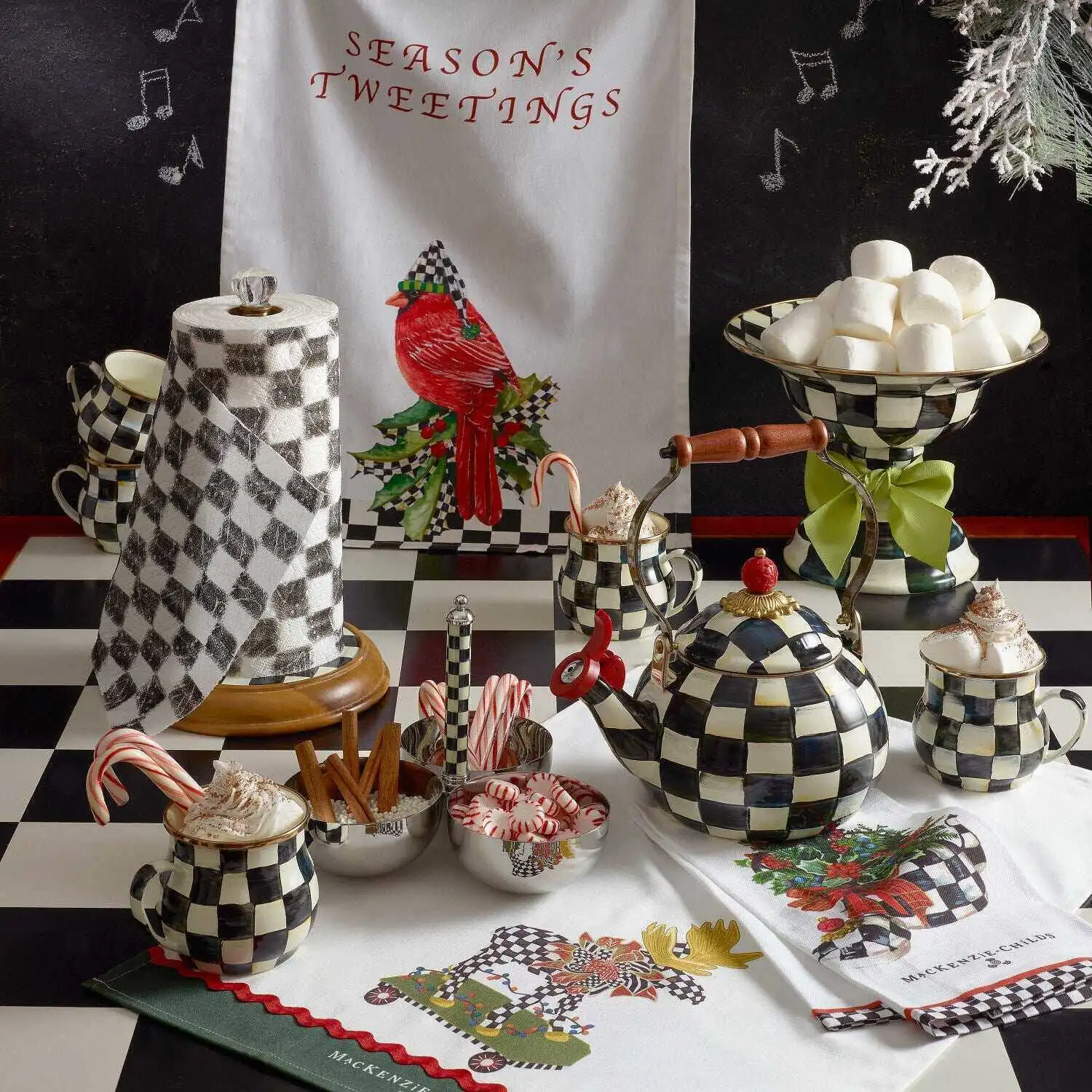 Whistling while it works, the Courtly Check® Enamel Whistling Tea Kettle lets you know when your water is ready. So pour yourself a cup of tea or fire up the French press, because when you hear that pretty sound, you know your day is about to get a little bit better. Hand-painted with our signature black and white checks over a heavy-gauge steel underbody, it also serves to beautify your stovetop even when it’s not in use.