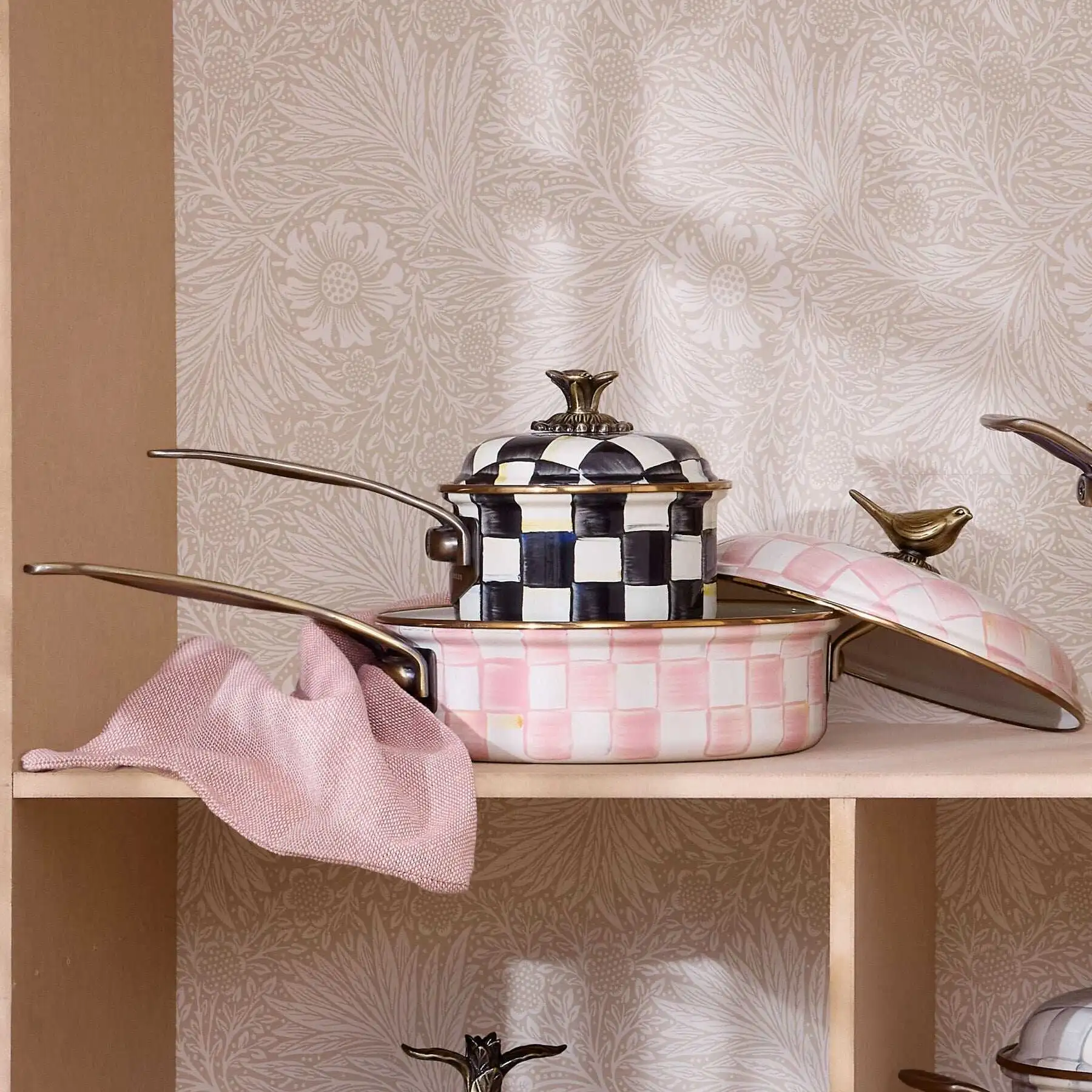 From stovetop to tabletop, our Rosy Check? 3 Qt. Saute Pan transitions with more than a dash of panache. Imagine how your signature sauces will stand out when served up in a dish bedecked with our pink and white pattern. And to top it all off, a sweet sparrow serves as a delightful knob, as unique as it is useful.