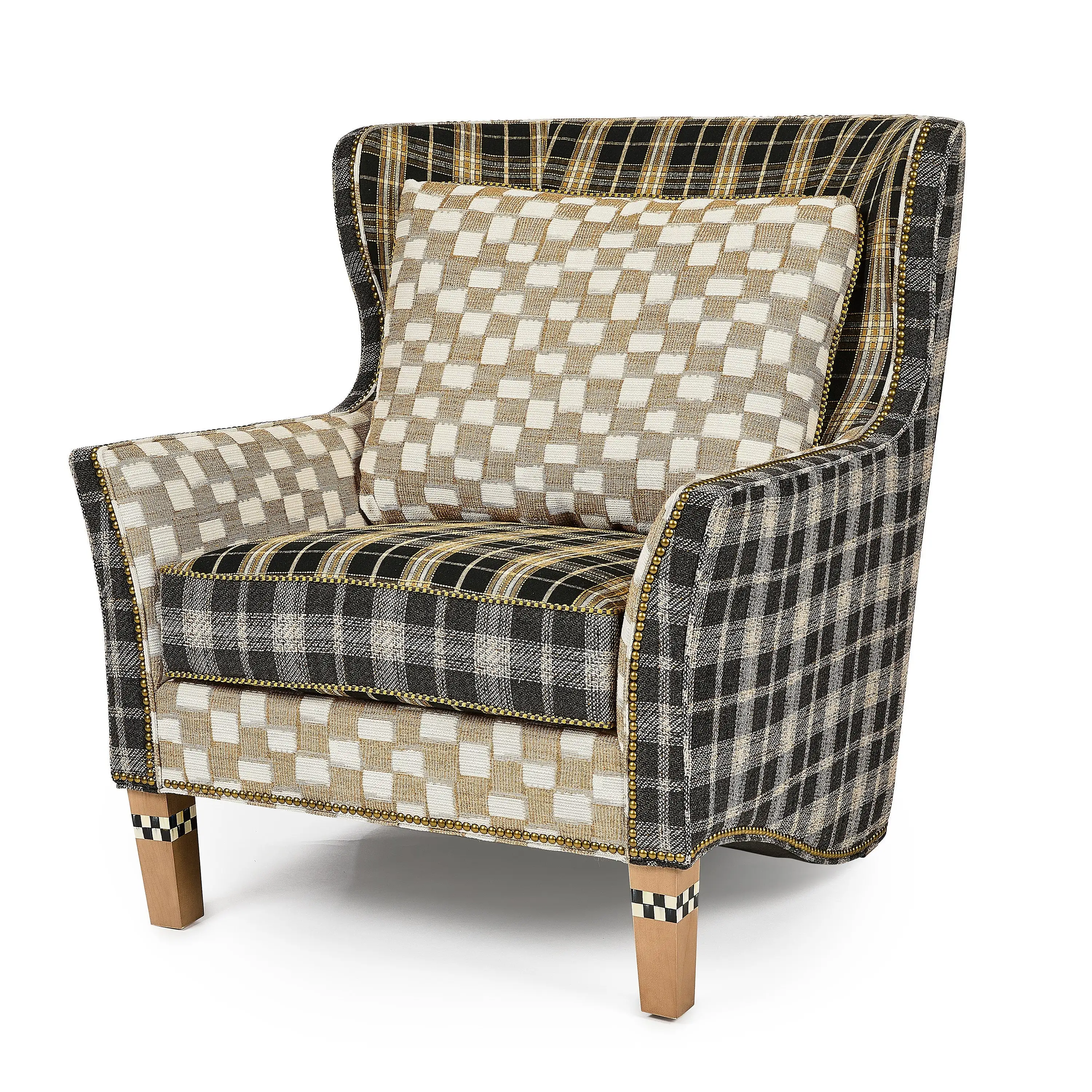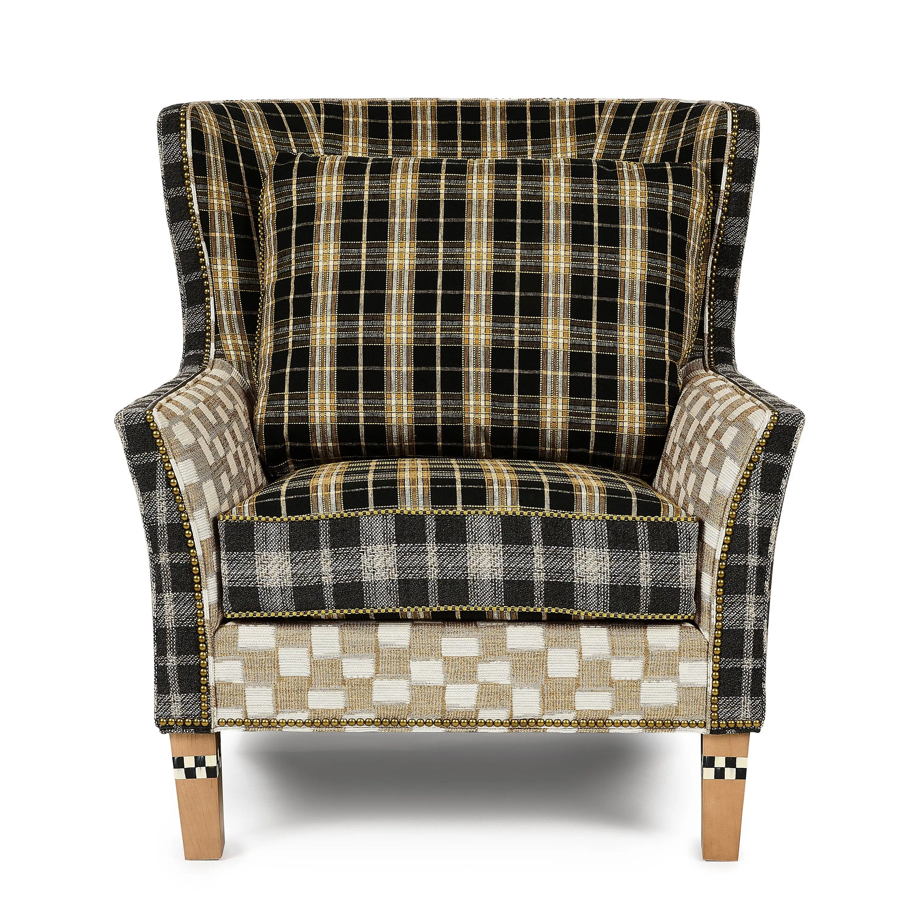 Enjoy classic charm with bold personality with the Mad for Plaid Wing Chair, which features a daring mix of fabric, color, and patterns, with beige, honey yellow, black, and grey, all set atop hand-painted legs. It¡¯s the perfect piece for those who love statement-making furniture. Pairs well with pieces from our iconic Courtly Check or Mocha Check collection.