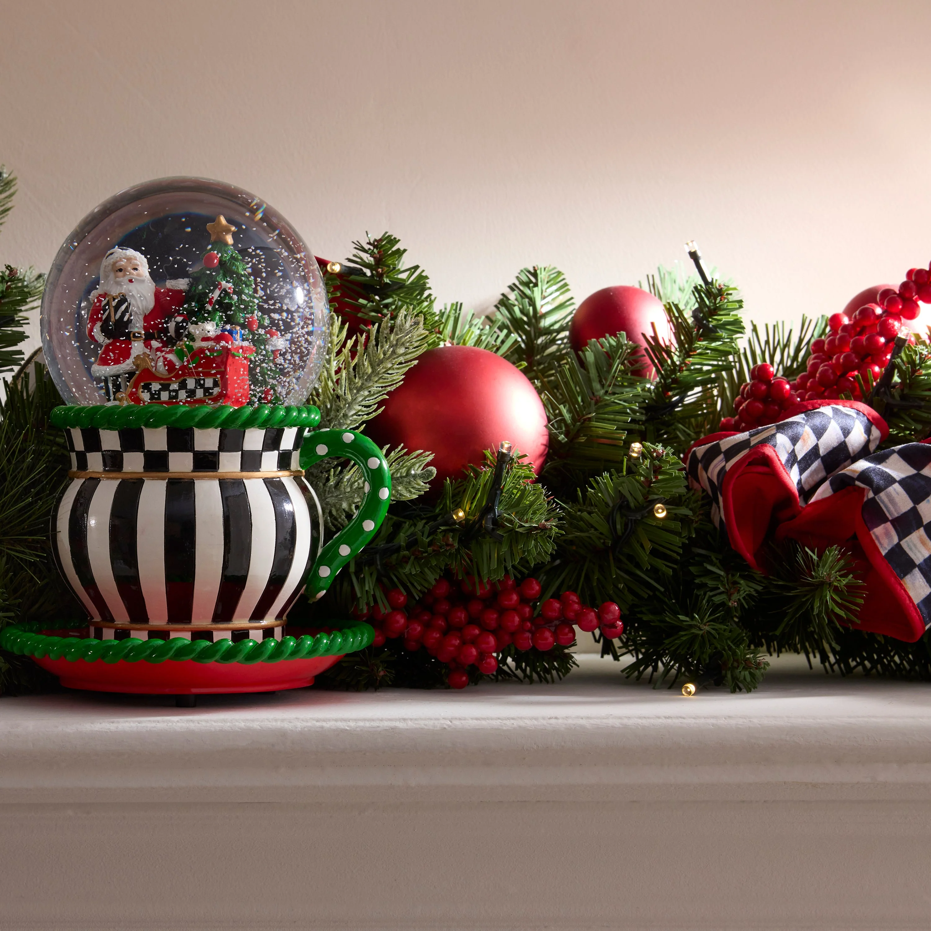Celebrate the magic of the season with the Merry Christmas Illuminated Garland. This charming garland with soft twinkling and bold pops of red-lined Courtly Check ribbon and baubles brings a cozy glow to the home.