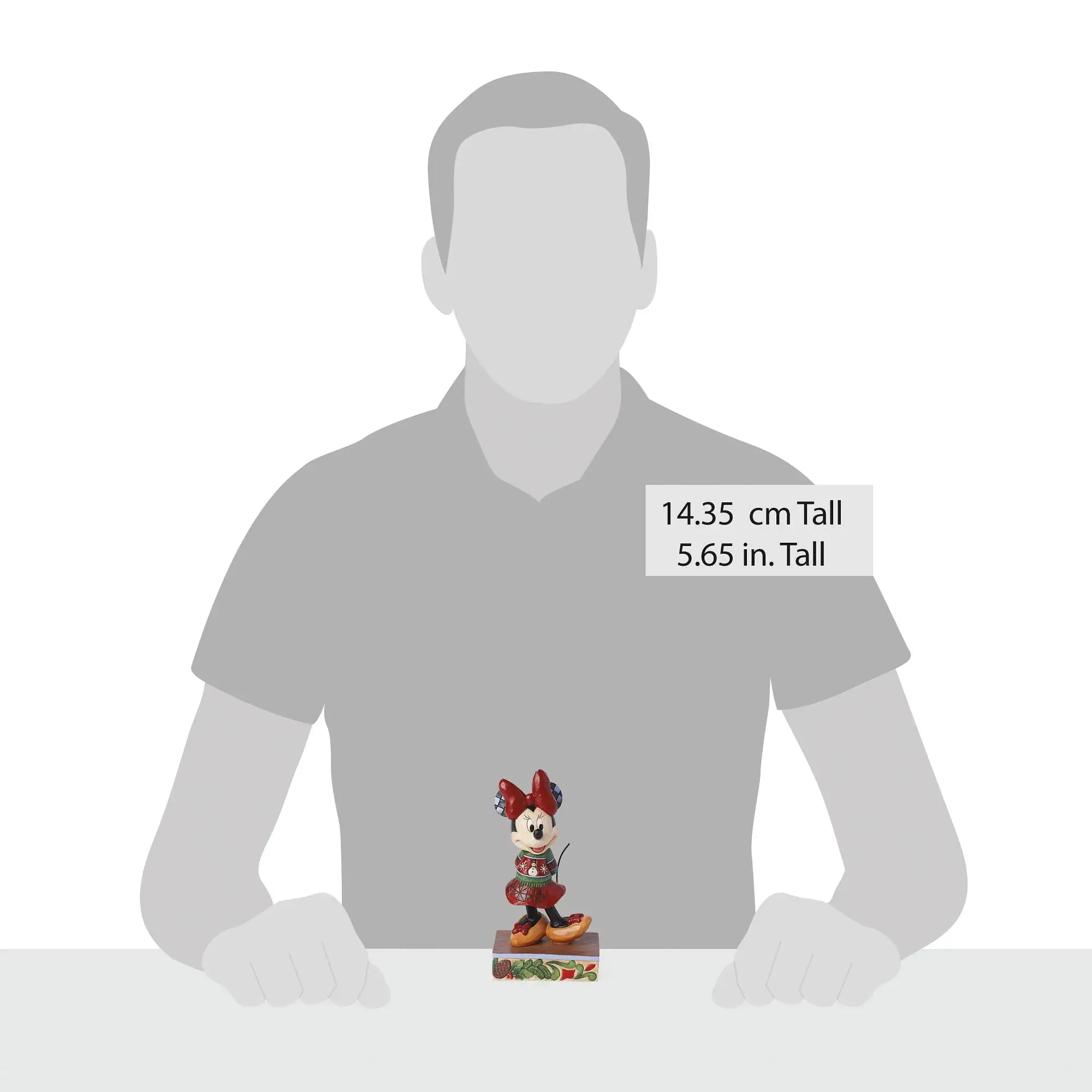 This festive design of Minnie Mouse from Jim Shore features the iconic character wearing a holiday sweater and a smile. Hands behind her back, Minnie shows off her red and green threads. She stands on a stage of mistletoe and rosemale.