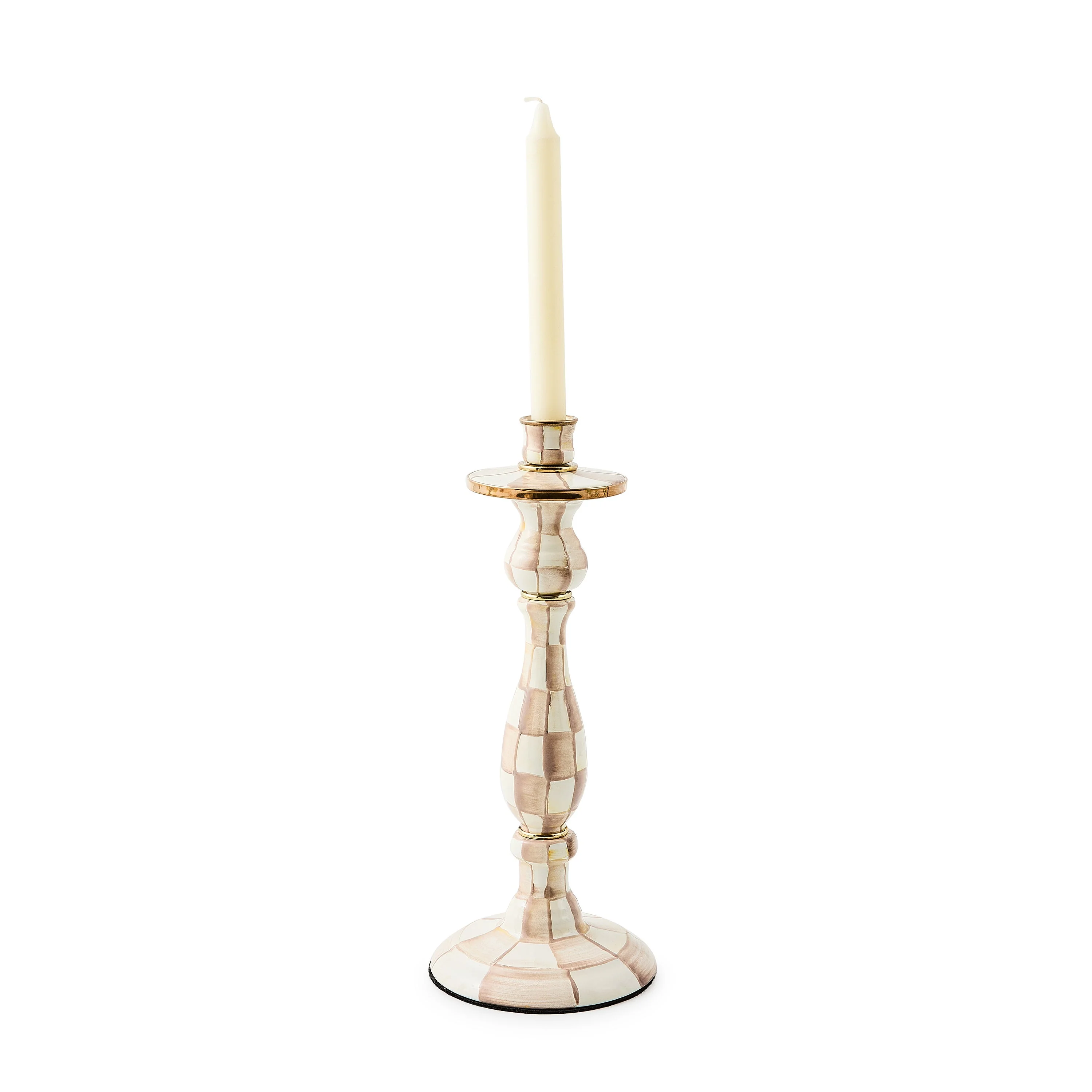 The Mocha Check Large Candlestick is made of enameled steel, rimmed in bronzed stainless steel, and decorated with hand-painted, color-dragged Mocha Checks. Display it with a dinner candle singularly or with its Mocha Check counterparts for a dimensional grouping.