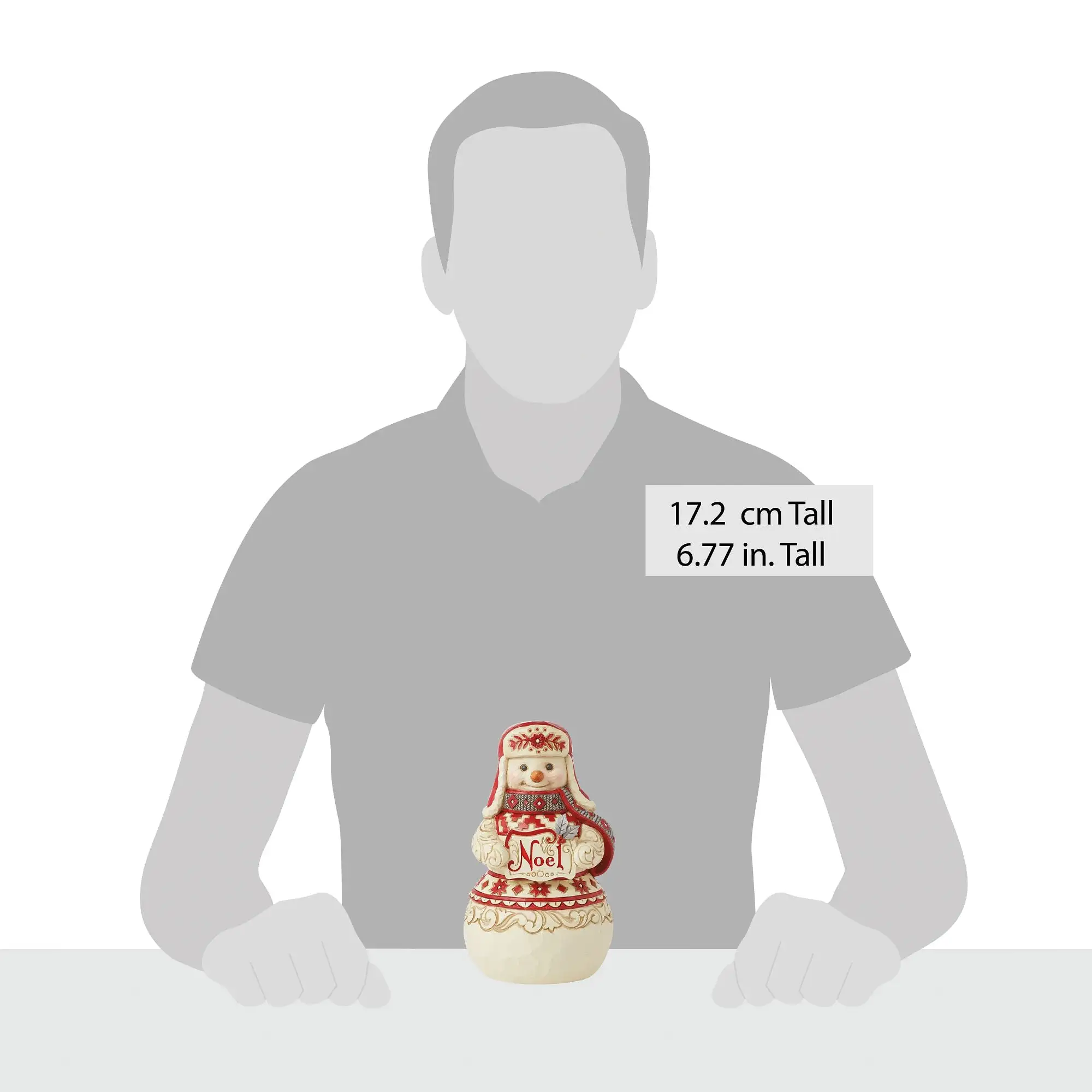 This red and white snowman from Jim Shore spreads Christmas cheer with a smile and rosy cheeks. He wears a Nordic inspired patterned sweater featuring flowers and patchwork details. Wearing a furry trapper hat, he holds a Noel sign with mistletoe.