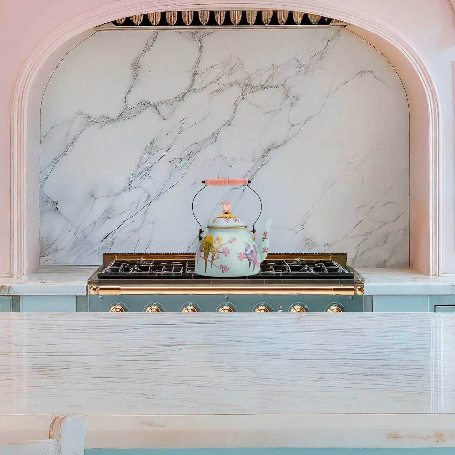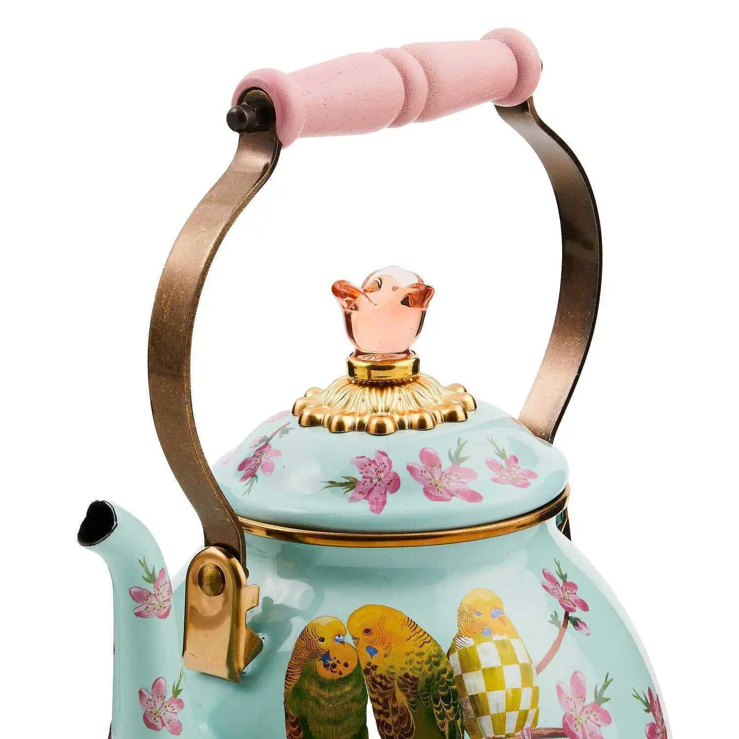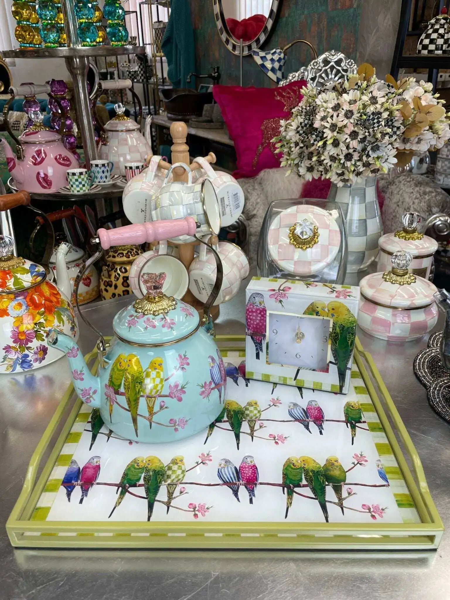 Suit your personali-tea with The Tea Kettle Collective. Make your home tweet home for the birds with our Parakeet Party 2 Quart Tea Kettle, featuring stylish MC parakeets on a heavy-gauge steel underbody, finished with a wood handle and a flower-shaped, pink glass knob on the lid. Each special-edition Collective kettle makes a great cup of tea, of course, and adds MacKenzie-Childs style to your stovetop. Don’t be surprised that you need more than one.