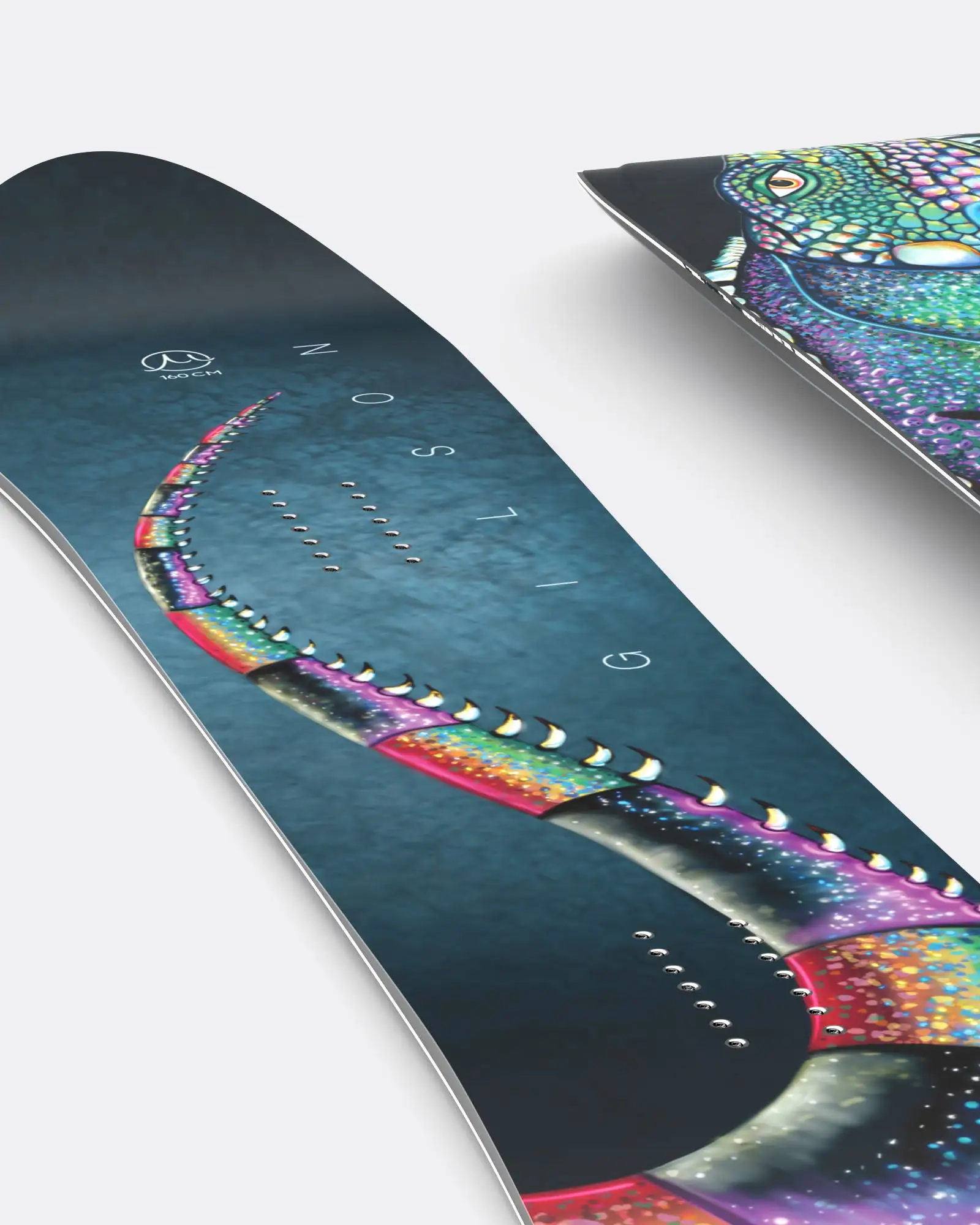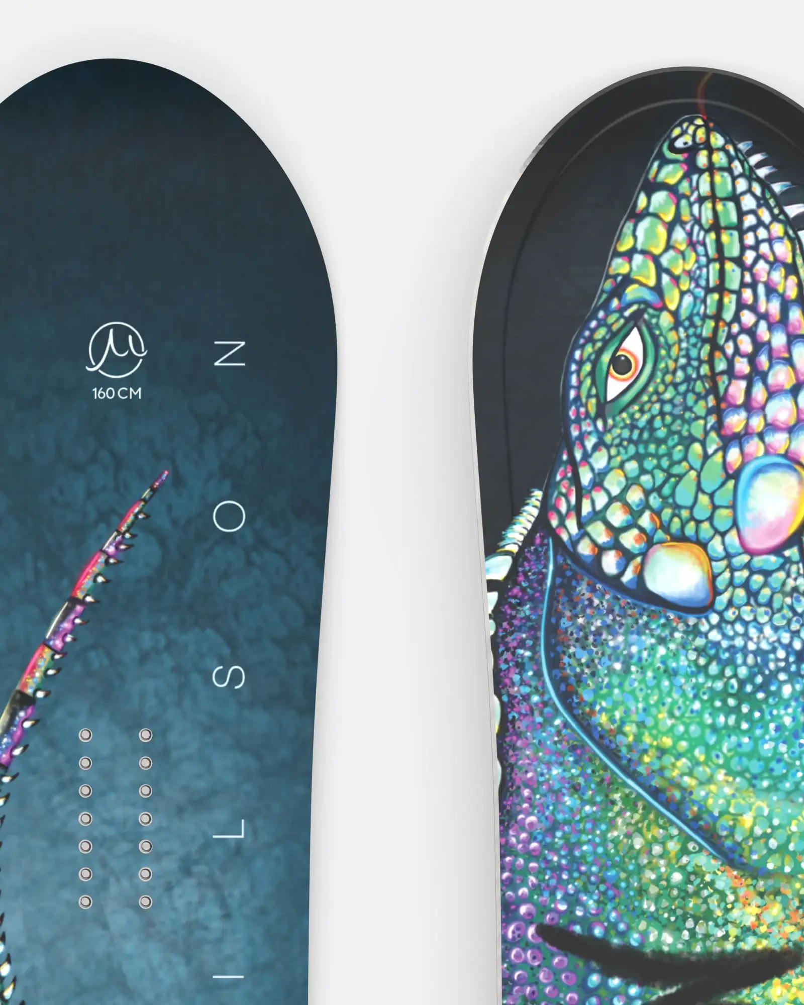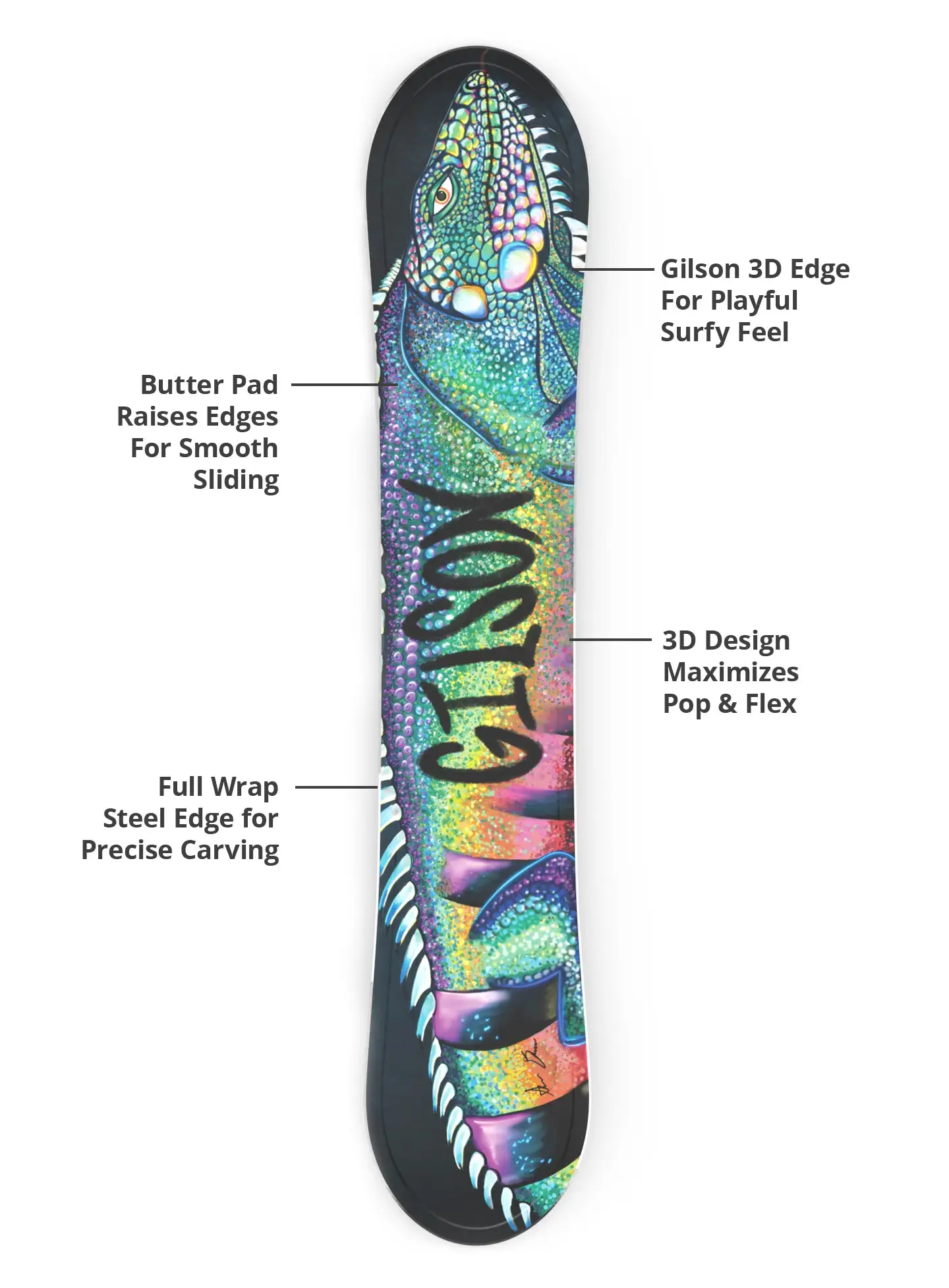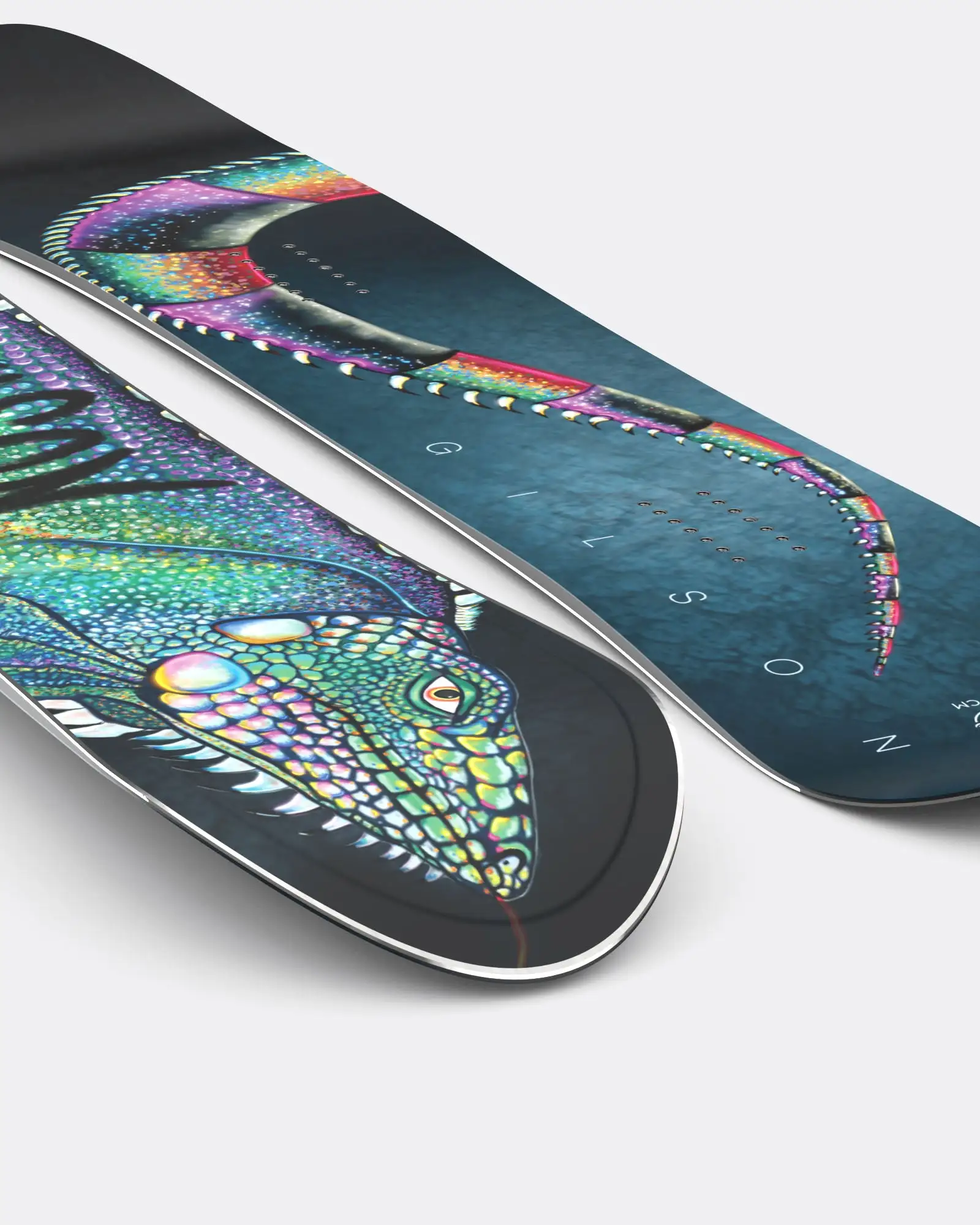 The Reptilian Brain Snowboard brings bold reptile inspired artwork from Pacific Northwest artist Shaun Davis to the mountain. Featuring vivid scales, a coiled tail, and hypnotic colors, this Limited Edition deck is guaranteed to turn heads in the lift line. Built on GILSON’s Hybrid Camber All Mountain design and backed by a 5 year warranty, it delivers smooth surfy performance across powder, groomers, and park runs.